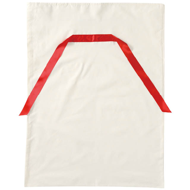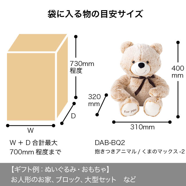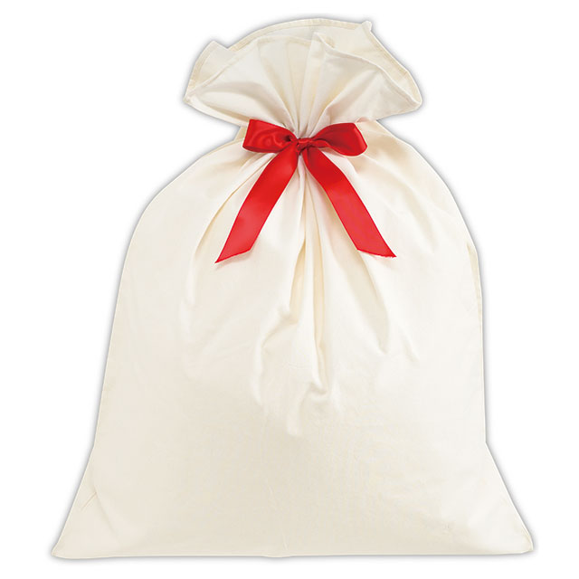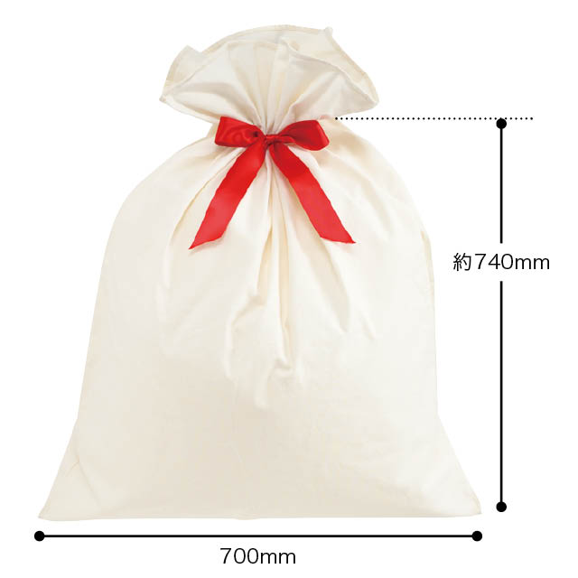 コットンのような白い布製のリボン付巾着バッグ(特大サイズ)です。まるでサンタクロースが運んできた大きなプレゼント袋のよう!ぬいぐるみやクッション、おもちゃ、楽器、家電製品など、大きめギフトにも対応可能な大容量サイズ。複数アイテムの詰め合わせギフトにもぴったりです。