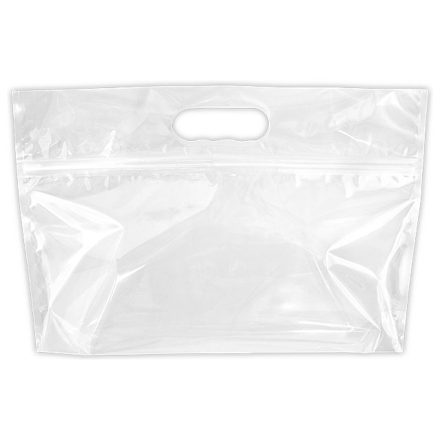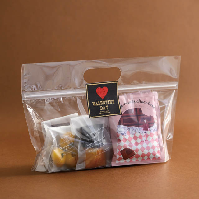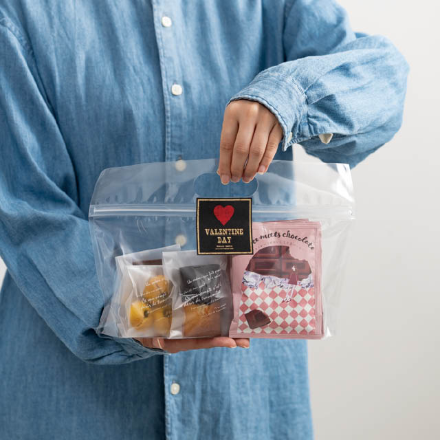 透明無地のジップ付バッグです。ワイヤータイやテープなど袋の口を閉じる手間も無く、簡単にセットアップできます。小判抜きの持ち手があるので、店頭からレジまでお客様が持ち運びやすい仕様です。一般的なドリップコーヒーのパックを入れていただくのにぴったりな高さがあり、焼菓子とセットしていただくことで簡単におしゃれなプチギフトが完成します。
