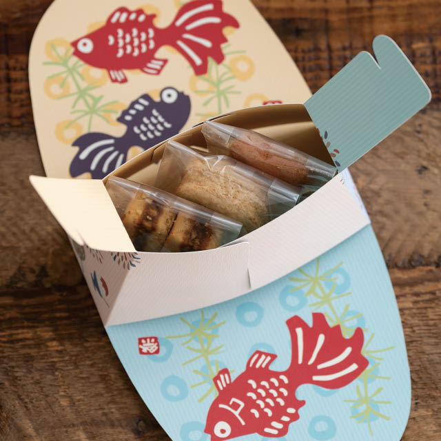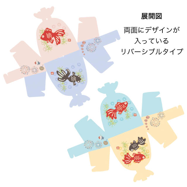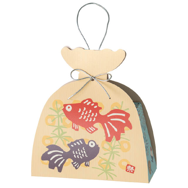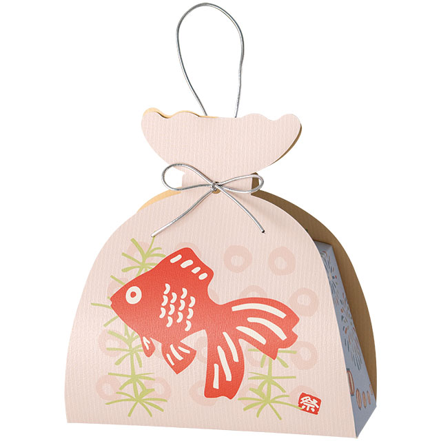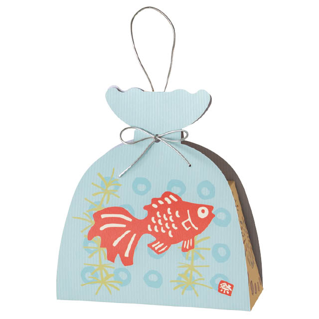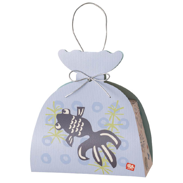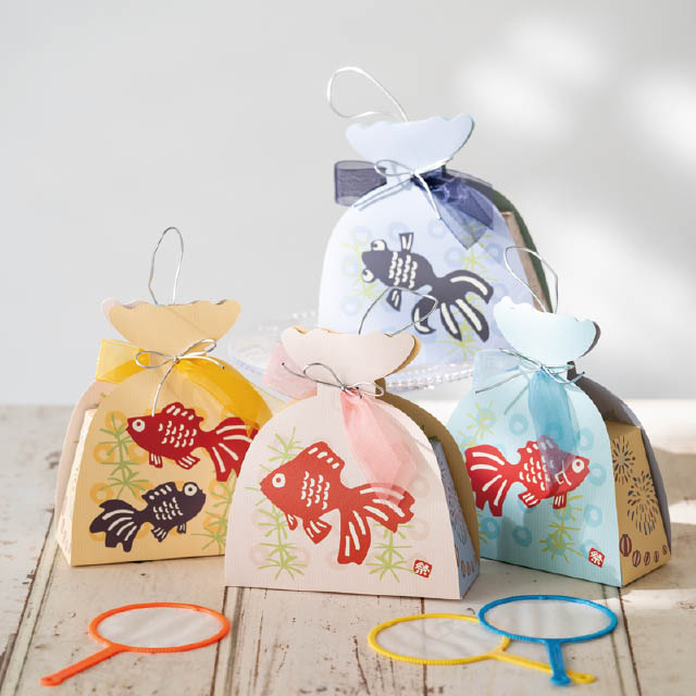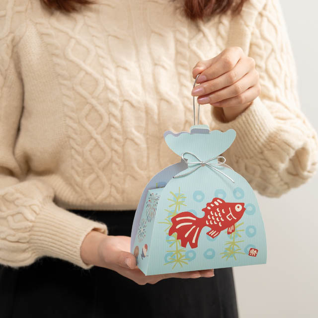 金魚袋デザインのギフトボックスです。夏祭りの金魚すくいを連想させるデザインは、ギフトシーンにワクワク感を演出。裏表両面にデザインが入ったリバーシブルタイプなので、前後・裏表の4面で赤と黒の金魚のイラストが4種類楽しめるのもポイントです。付属のゴムリボンをつけるだけで可愛く仕上がるお手軽さも魅力。マドレーヌ3個程度サイズ感で、夏のプチギフトや、お子様へのプレゼントにぴったりです。可愛い和風デザインは、和菓子店さまにはもちろん、洋菓子店さまにもおすすめです。