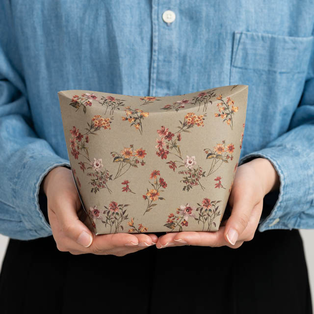 花柄のギフトボックスです。上部がカーブしたおしゃれな形状と、落ち着いた色合いのグレージュに花柄をあしらったヴィンテージな雰囲気が魅力。付属のシールをお好みの場所に貼るだけでラッピングが完成し、資材選びに悩む必要がありません。シールをお好みのリボンや小物に変えると、オリジナリティあふれる特別なギフトラッピングに。ギフトシーンに合わせて自由にアレンジが楽しめるギフトボックスです。
