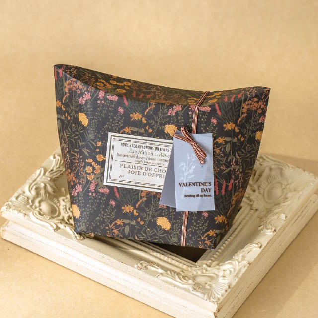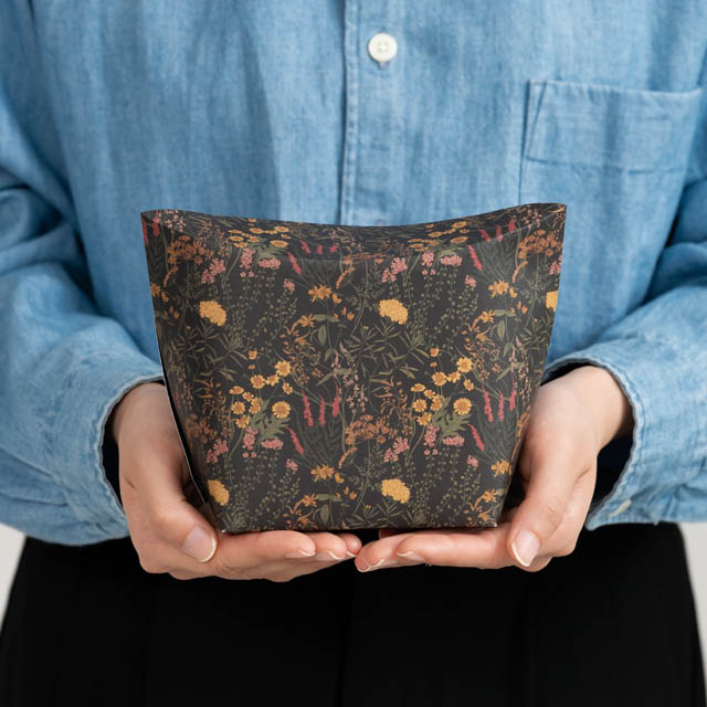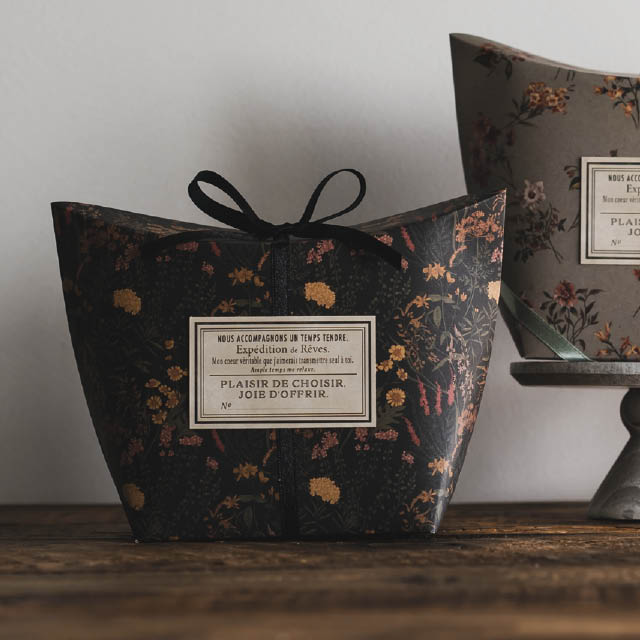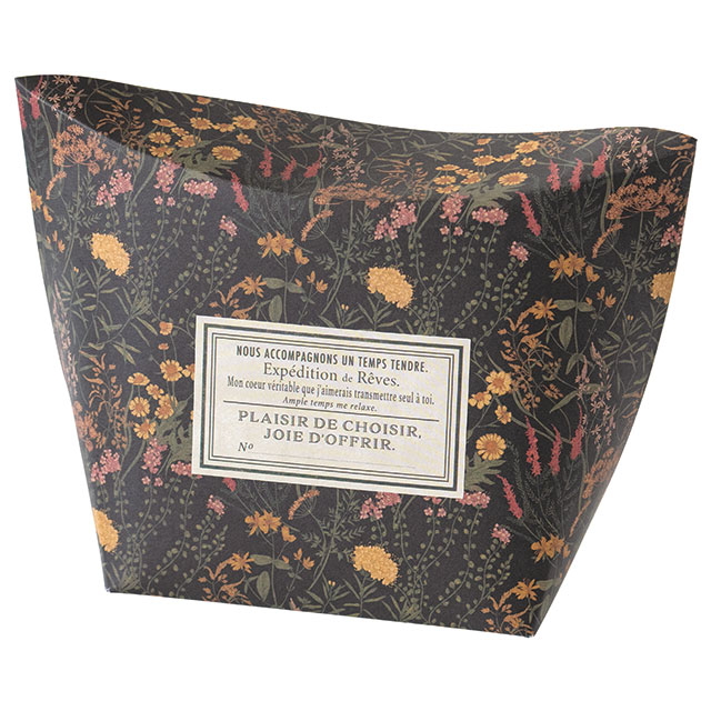 花柄のギフトボックスです。上部がカーブしたおしゃれな形状と、落ち着いた色合いのネイビーに花柄をあしらったヴィンテージな雰囲気が魅力。付属のシールをお好みの場所に貼るだけでラッピングが完成し、資材選びに悩む必要がありません。シールをお好みのリボンや小物に変えると、オリジナリティあふれる特別なギフトラッピングに。ギフトシーンに合わせて自由にアレンジが楽しめるギフトボックスです。