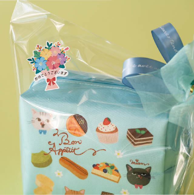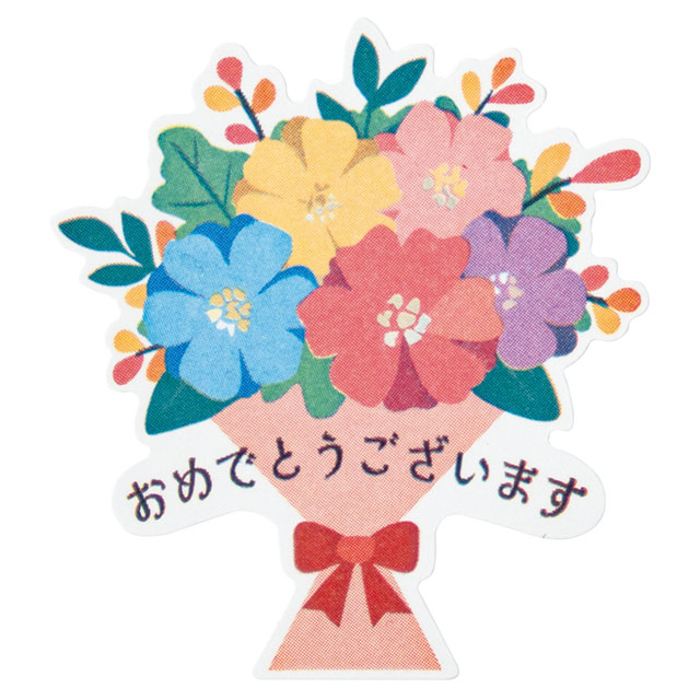 可愛い花束デザインに「おめでとうございます」のメッセージが入ったギフトシール(強粘着)です。お祝いの定番の花束をモチーフにした老若男女問わず使いやすいデザインで、お祝い事や運動会、表彰式など様々なイベントでご活用いただけます。手軽にお祝いの気持ちを伝えられるメッセージシールとして、幅広いシーンで活躍します。強粘着シールなので、梨地バッグなどのマット素材にもお使いいただけます。