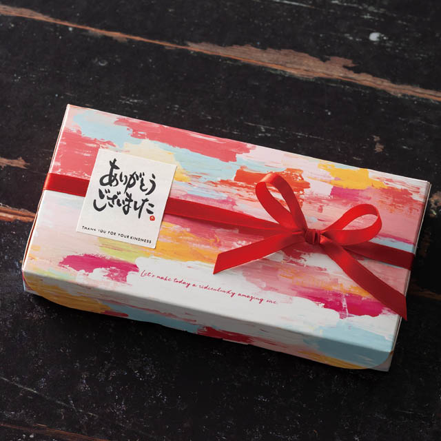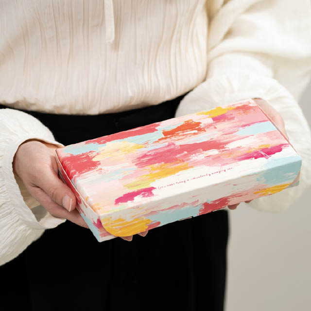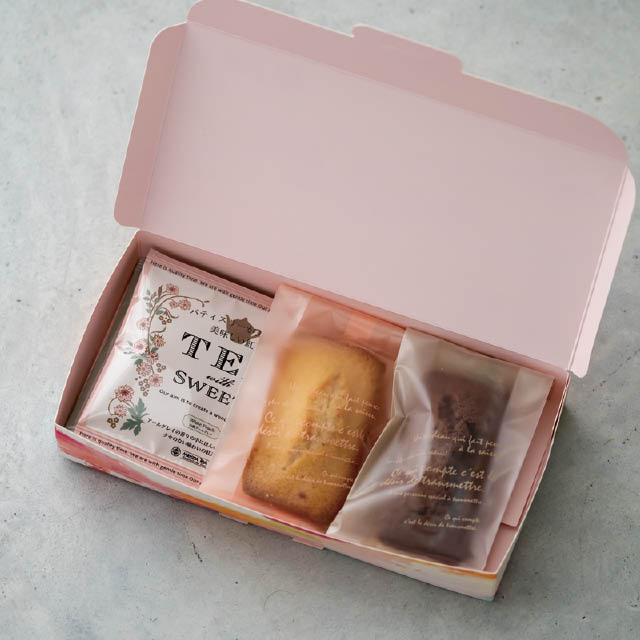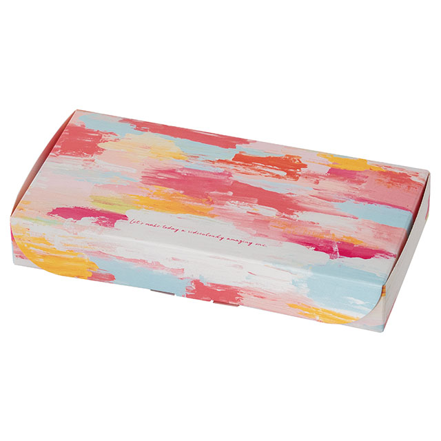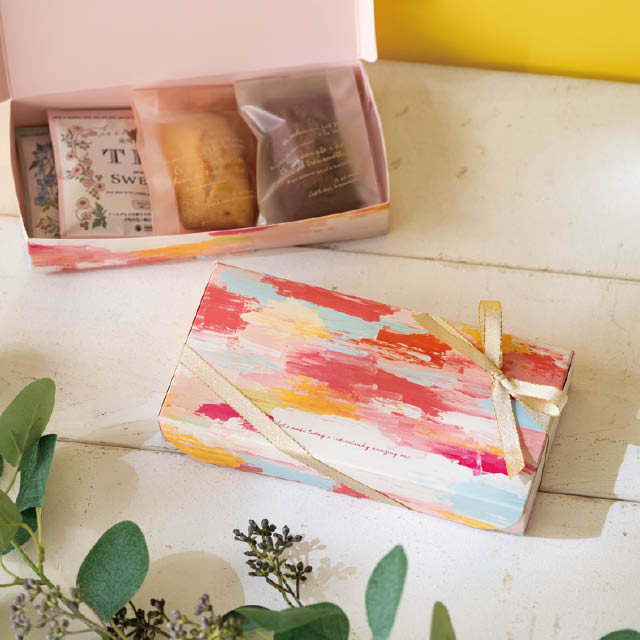 華やかなオイルペイント柄のギフトボックスです。明るいピンクを基調にしたカラーリングで、春のギフトにぴったり。和洋どちらのタイプのメッセージシールにもマッチするため、幅広いシーンで活躍します。平置きタイプでパッケージ上面が大きく見え、店頭でもしっかり存在感をアピール。身側に横フラップがなくお菓子がしっかり見えるので見栄えよくレイアウトでき、また緩衝材要らずで効率的に作業ができるのもポイント。組み立ても簡単で不慣れな方や大量に作る時にもおすすめです。ヘッズの小分け紅茶のパックが綺麗に入るので、焼き菓子とセットにしたお手軽ギフトなどに最適です。