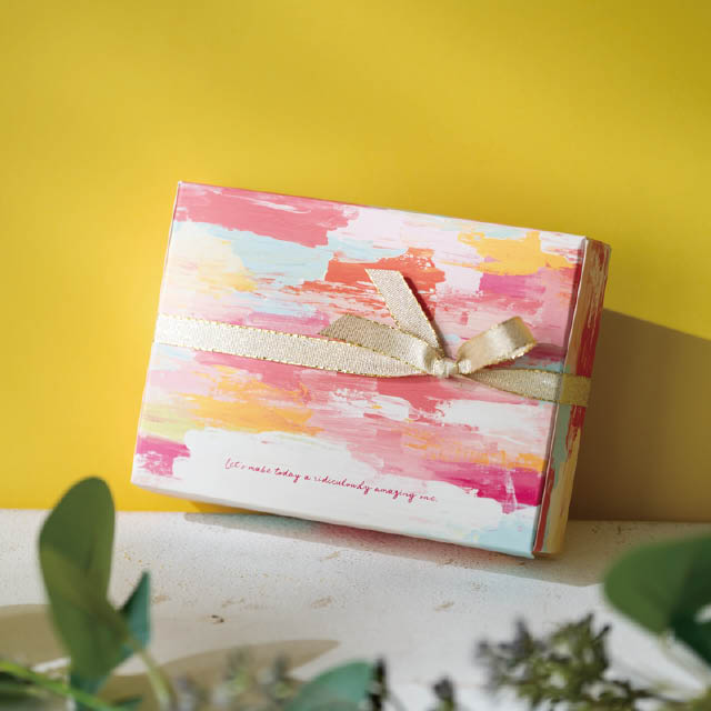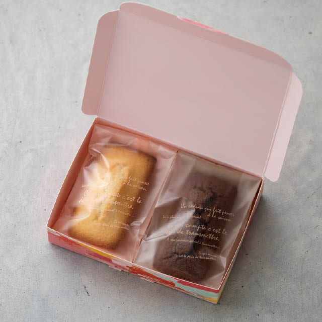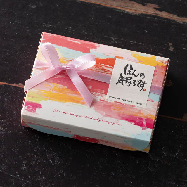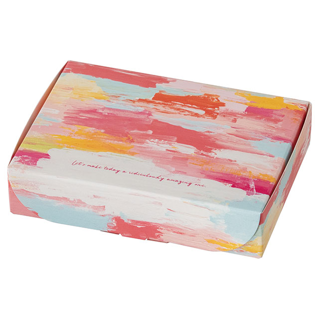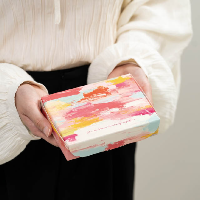 華やかなオイルペイントデザイン柄のギフトボックスです。春のギフトにぴったりの明るいピンクを基調にしたカラーリングで、焼き菓子3個のプチギフトにおすすめ。和洋どちらのタイプのギフトシールにもよく合い、店頭で使いやすいデザインです。平置きタイプでパッケージ上面が大きく見え、ギフトの存在感をアップ。身側に横フラップがなくお菓子がしっかり見えるので、見栄えよくレイアウトできます。緩衝材不要で手間もかからず、効率的に包装作業ができるのもポイント。組み立ても簡単で不慣れな方や大量に作る時にもおすすめです。