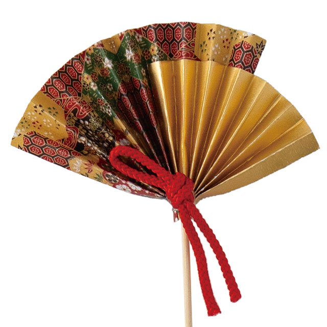 扇モチーフのフラワーピックです。美しい千代紙と組紐が上品で、華やかな和の雰囲気を演出します。挿すだけで迎春のフラワーアレンジメントが完成するフラワーピックです。