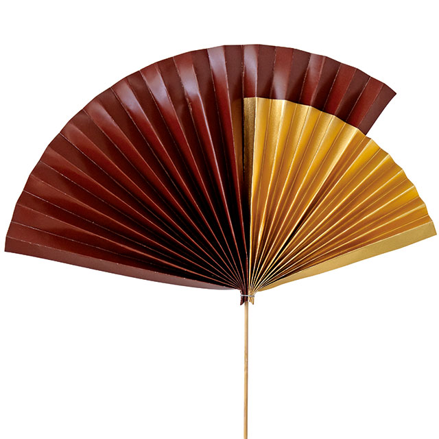 扇モチーフの大きなフラワーピックです。幅40cmの圧倒的な存在感でお正月・迎春のフラワーアレンジメントの背面を豪華に彩ります。落ち着きのある赤と金の豪華な見た目ながら、お手頃な価格なのもポイントの迎春フラワーピックです。