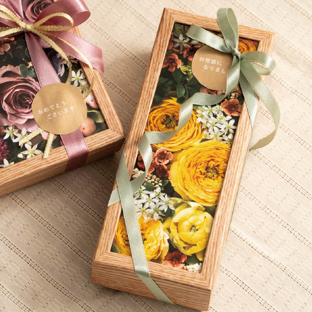 美しい花の写真とリアルな木目のフレームを組み合わせた、上質な印象のギフトボックス(貼箱)です。フレーム部分と写真面に段差があり、まるで本物のアートパネルのような立体感。側面にも丁寧な木目デザインが施されており、高級感あふれる仕上がりのギフトボックスです。高さ50mmの薄型の箱なので、立ててディスプレイしても中身が固定されて崩れにくいのもメリットです。ギフト感たっぷりの見栄えで、春の贈り物や特別なギフトの華やかな演出にご活用ください。