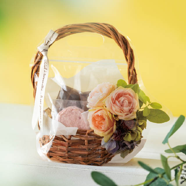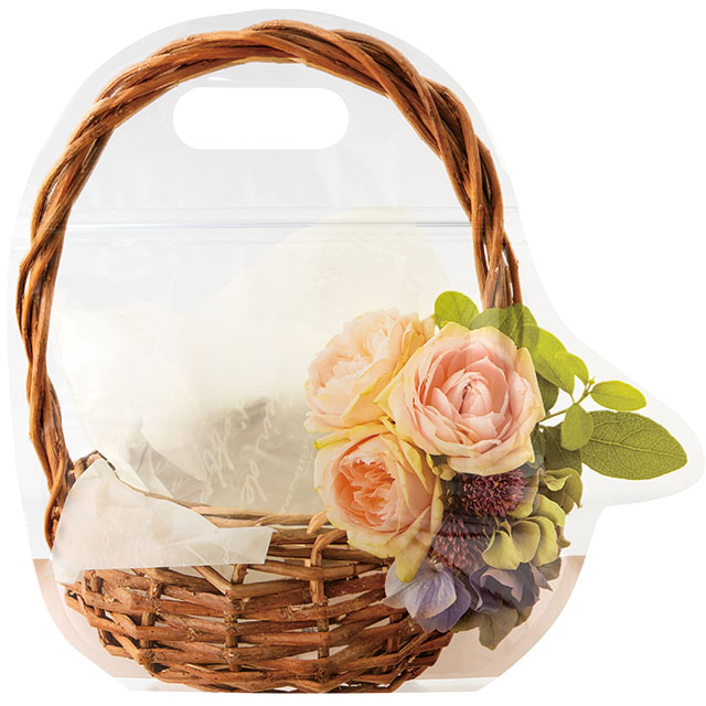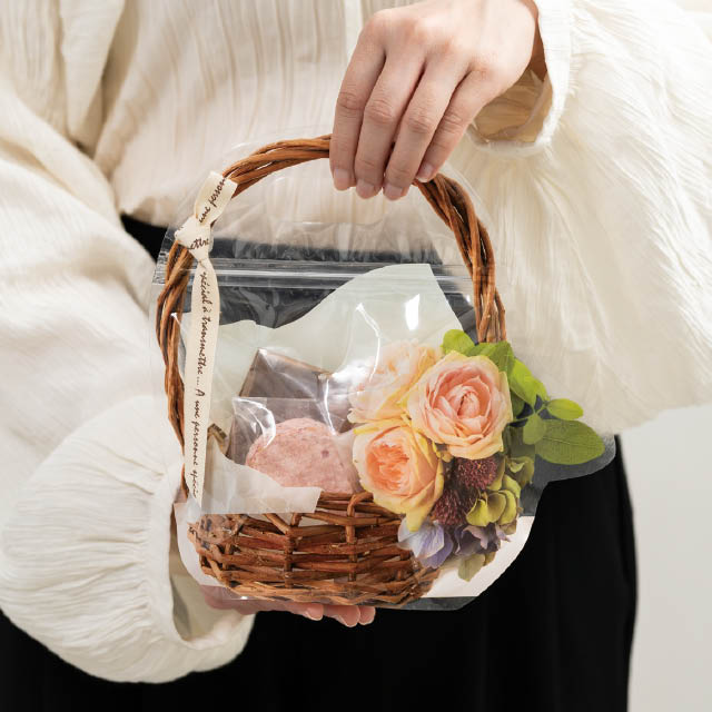 カゴデザインのジップ付スタンドバッグです。お花をあしらったブラウンのカゴの写真を使用したデザインで、このスタンドバッグだけで華やかなラッピングが完成。中敷きの紙を印刷した背面がよりリアルさを演出し、まるで豪華なカゴ盛りのようにお菓子を引き立てます。お菓子を入れて袋ジップで止めるだけで詰め合わせギフトが作れる手軽さも魅力で、忙しい時期の時短アイテムとしてもおすすめです。持ち手付きで手に取りやすく、レジまでお客様が持ち運びやすいのもポイント。焼き菓子が4つ程度入るお手頃サイズで、自家用やプチギフトにもぴったりのスタンドバッグです。