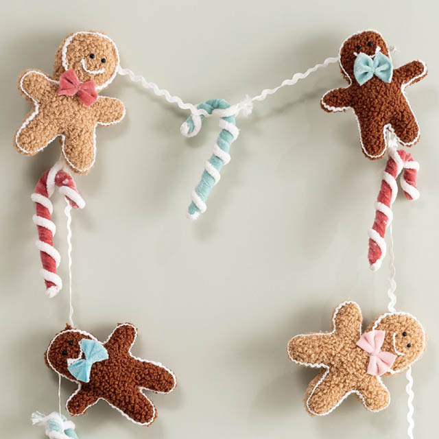 クリスマスにぴったりのジンジャーマンガーランドです。蝶ネクタイ型のリボンがアクセントの2色のジンジャーマンと、カラフルなキャンディケインが可愛らしく、店内を一気に華やかなムードに盛り上げてくれます。壁面やウィンドウ、棚周りなど、さまざまな場所に手軽に飾れる、華やかなクリスマス演出におすすめの店舗装飾アイテムです。