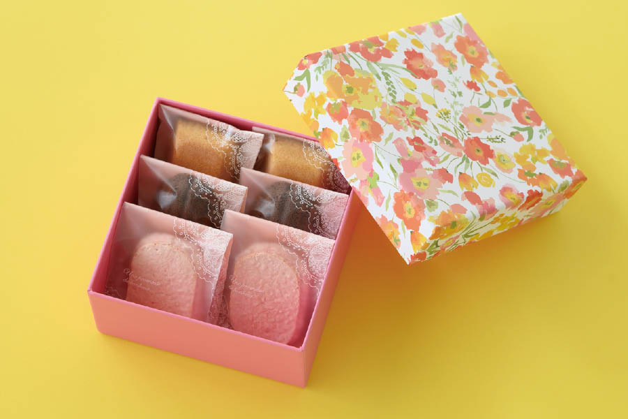 赤やオレンジの花柄がかわいいギフトボックス(貼箱)です。正方形で使いやすいサイズ感なので、置いてあるだけで店頭が華やかになります。同じデザインのペーパーバッグと並べるのもおすすめです。