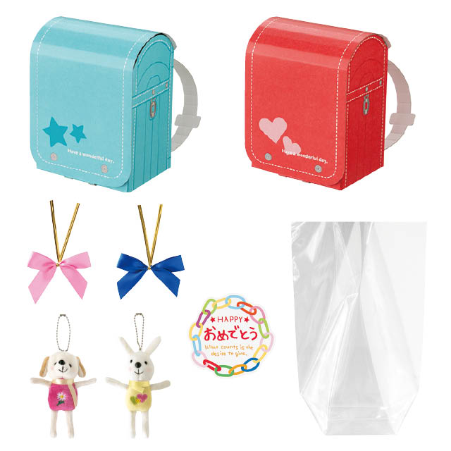 イベント資材は余ると困る!そんなお客様のお声から生まれた、入学祝いや春ギフトにおすすめのラッピング資材セットです。赤とブルーの2色のランドセルギフトボックスに、マスコットキーホルダー2色、ワイヤータイ、シール、OPP袋がセットになったお得なギフトラッピングです。1回の購入で資材が揃う、便利なラッピングセットをぜひお試しください。