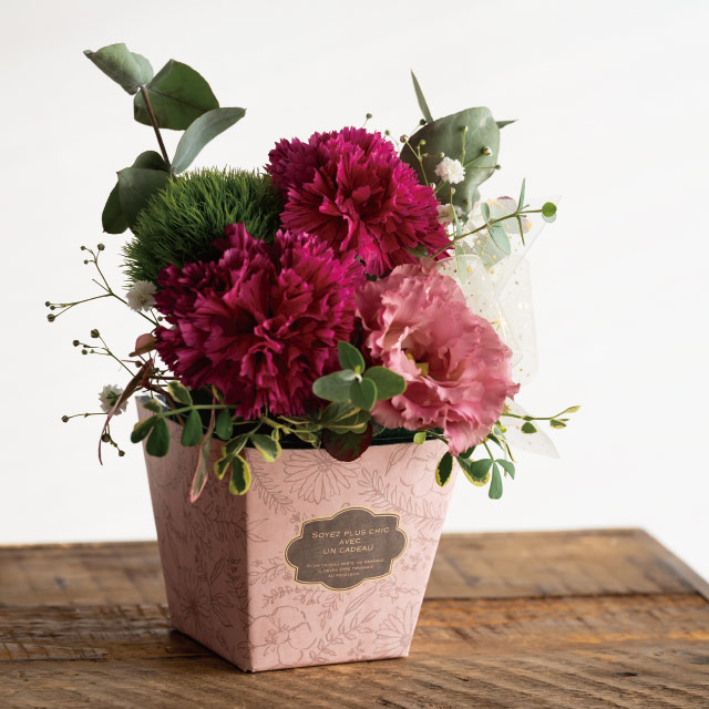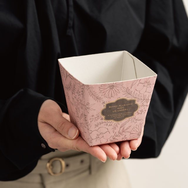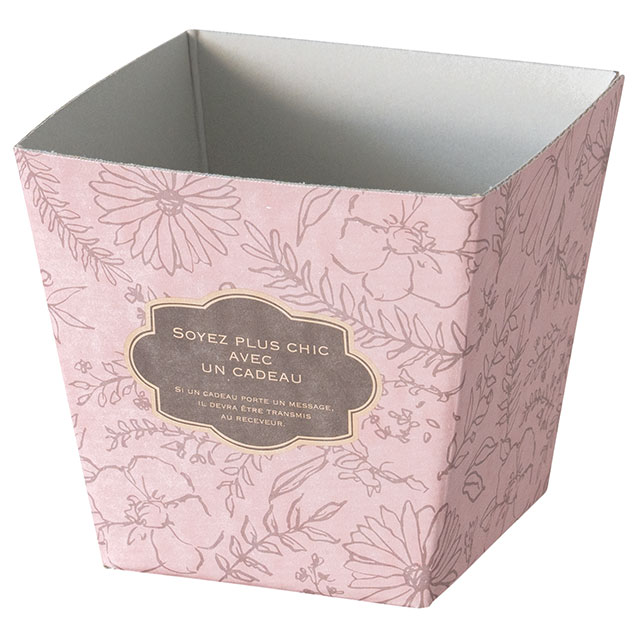 安価にフラワーアレンジメントが完成する紙製トレイです。優しいくすみピンクとボタニカルデザインが春先や母の日の売り場の雰囲気を演出します。別売りのインナーカップ(INC-SPS)をご利用いただくと、手間も管理もより手軽に!