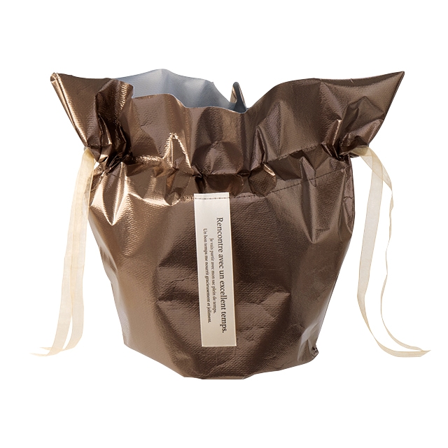 光沢感が印象的な巾着バッグです。重厚なブラウンで、いつもの鉢物もしっかりとしたギフトに早変わりです。