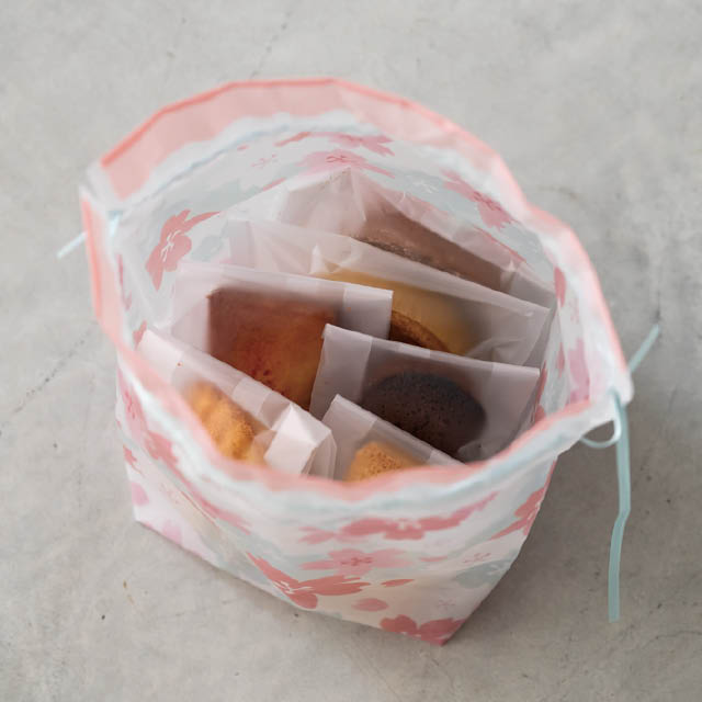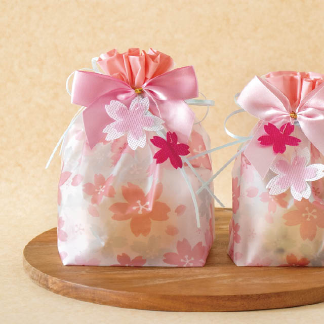 焼き菓子が6つ程度入るほどよいサイズ感で、春のギフトにぴったりのラッピング袋です。