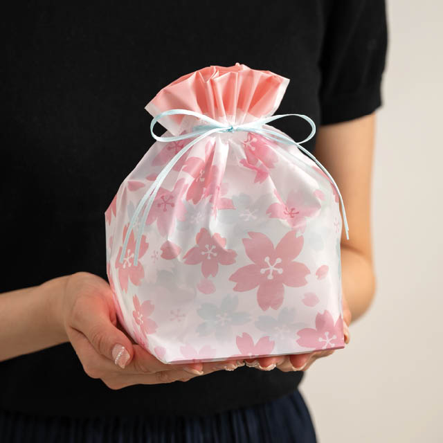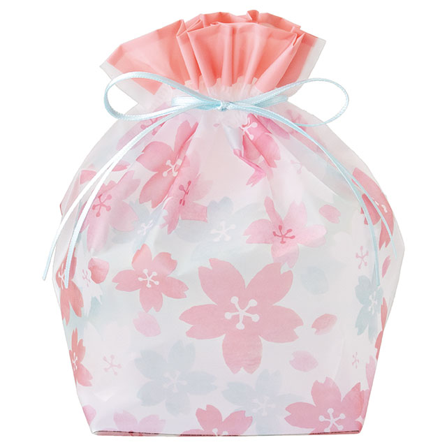 ほんのり透ける素材がオシャレなさくら柄のリボン付巾着バッグです。さくらの花が全面にデザインされており、2本使いの細いブルーのサテンリボンが可愛らしさに繊細な印象を添えています。