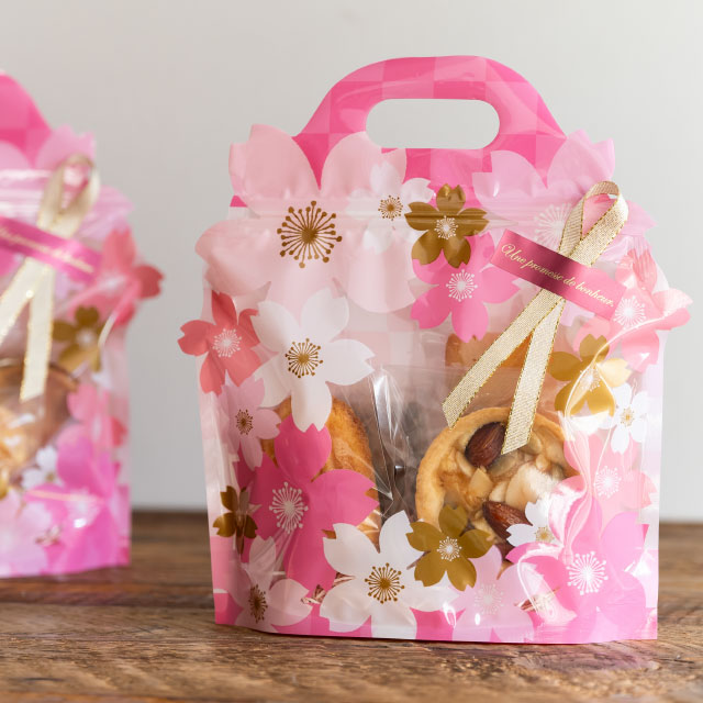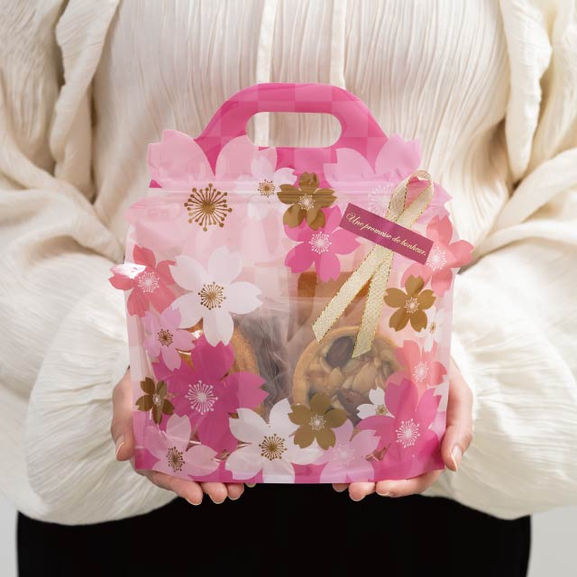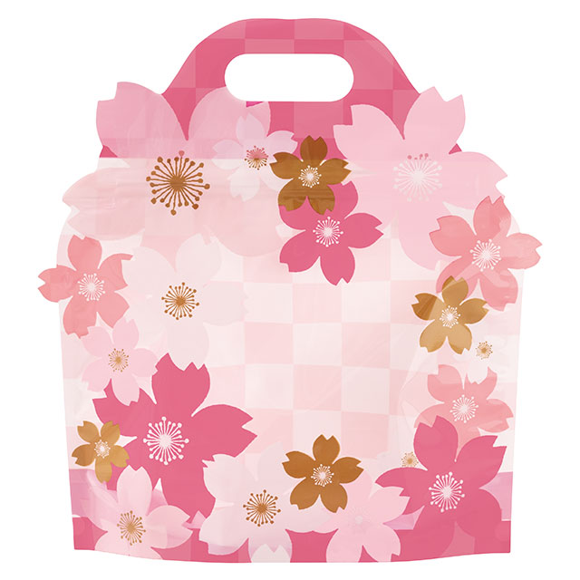 さくらの花を散りばめたデザインのジップ付バッグです。色とりどりのさくらの花がダイカットで飛びだす華やかで春らしいデザインで、さくらの花の間から見えるお菓子を引き立て、店頭でも目を引くアイキャッチになります。底マチ付きで自立し、ピンク色のハンドルが目を引き手に取りやすいのもポイントです。