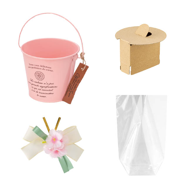 イベント資材は余ると困る!そんなお客様のお声から生まれた、春ギフトにおすすめのラッピング資材セットです。ピンクのブリキバケツに底上げ台紙、OPP袋、リボンワイヤータイがセットになったお得なギフトラッピングです。ボリューム満点の可愛いリボンワイヤータイはこのセットだけの限定品!1回の購入で資材が揃う、便利なラッピングセットをぜひお試しください。
