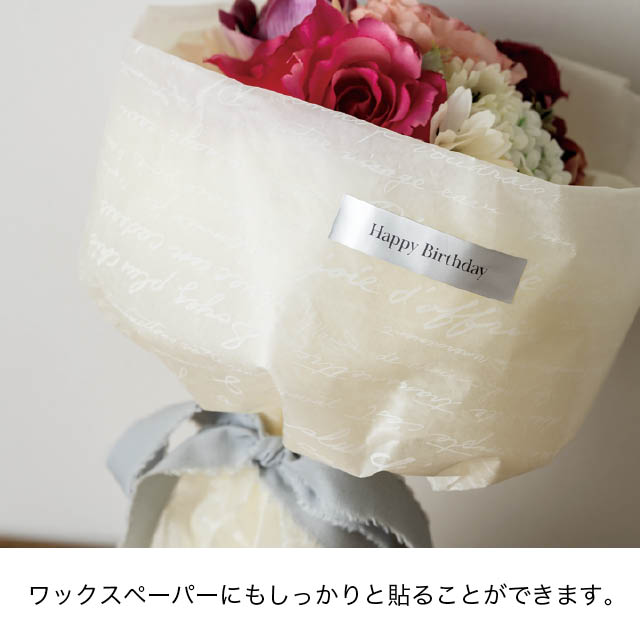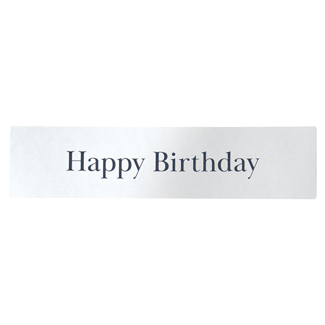 「Happy Birthday」のメッセージが入ったシルバーのギフトシールです。不織布、オーガンジー、ワックスペーパーの素材に使ってもはがれにくい超強粘着シールです。シルバーの光沢とシンプルなデザインがスタイリッシュで高級感を感じさせ、シーンを選ばず使いやすいメッセージシールです。