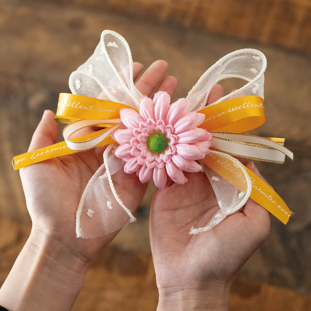 春ギフトにぴったりのリボン付ワイヤータイが登場しました。白のリボンをベースに、挿し色のピンクの造花と黄色のリボンが可愛いワイヤータイです。リボン結びや色の組み合わせが難しいと感じる方、繁忙期のラッピングを簡単にしたいという方にオススメです。