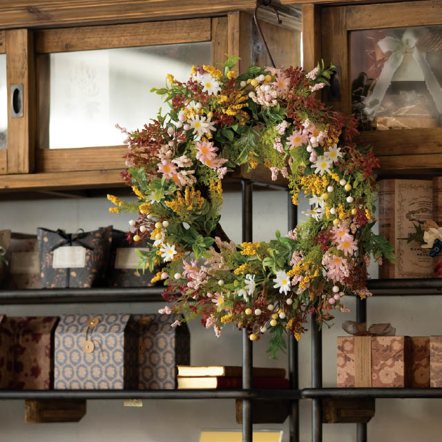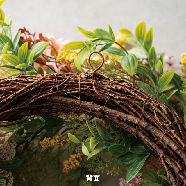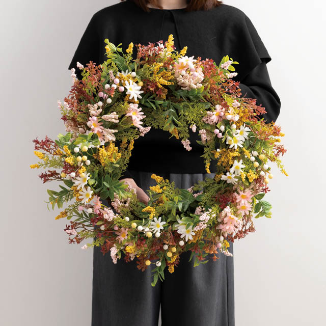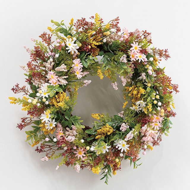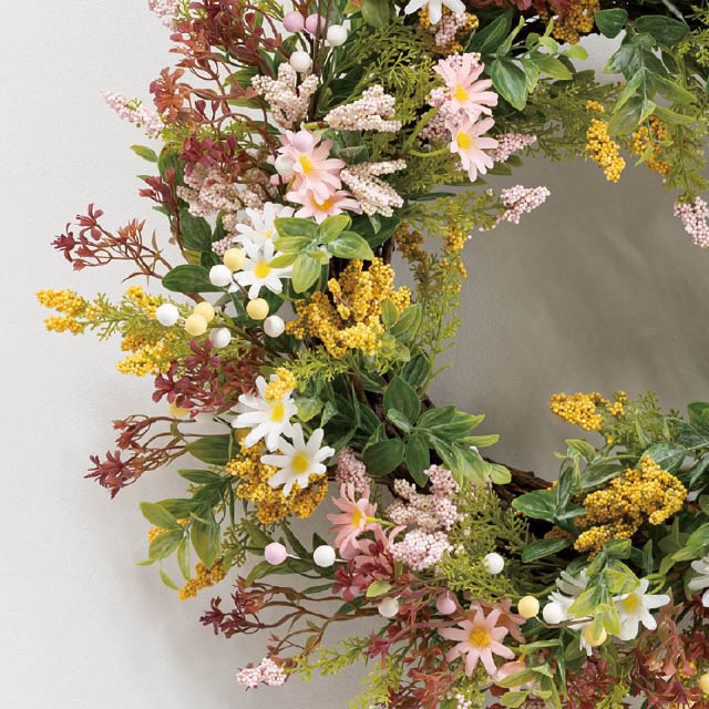 やさしいパステルカラーの造花リースです。リースの土台には天然の枝を使用し、ナチュラルな風合いをそのままに再現。淡いピンクやイエロー、ホワイトの小花とグリーンの葉っぱがバランスよく配置され、アクセントの木の実や小枝が奥行きを演出します。