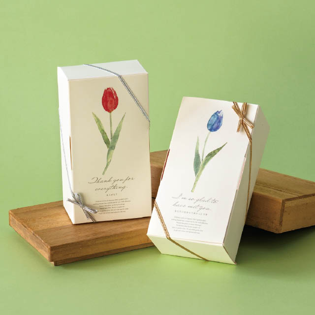 イベント資材は余ると困る!そんなお客様のお声から生まれた、春ギフトにおすすめのラッピング資材セットです。チューリップボックス2種(赤×黄色・ピンク×青)に、ゴムタッグ2色がセットになったお得なギフトラッピングです。ギフトボックスはフタの重ね方でチューリップの色が異なるので、チューリップ4色×ゴムタッグ2色で、8種類の組み合わせが作れます。1回の購入で資材が揃う、便利なラッピングセットをぜひお試しください。