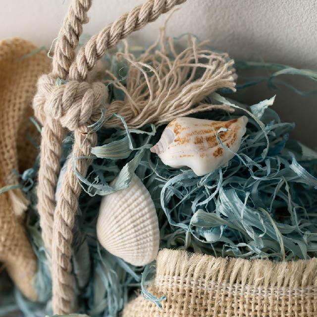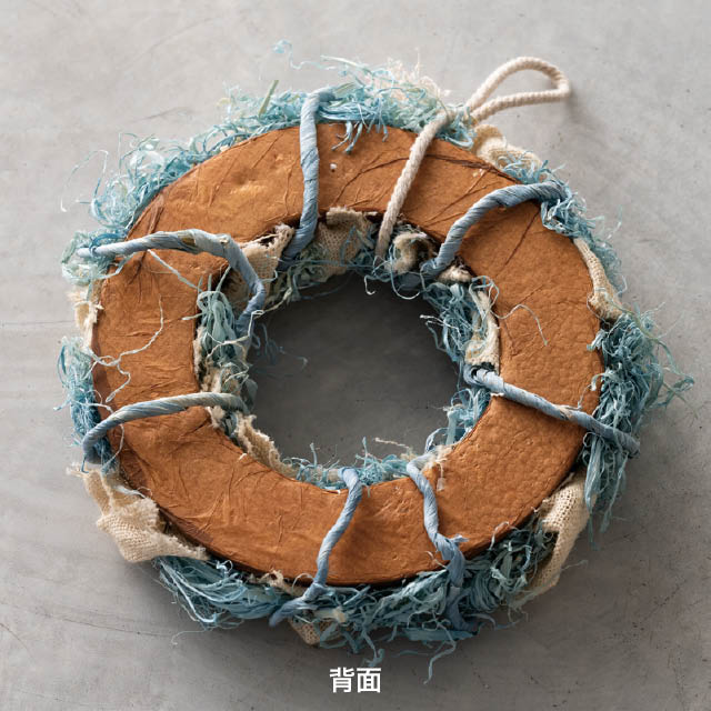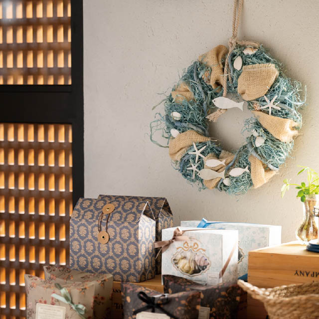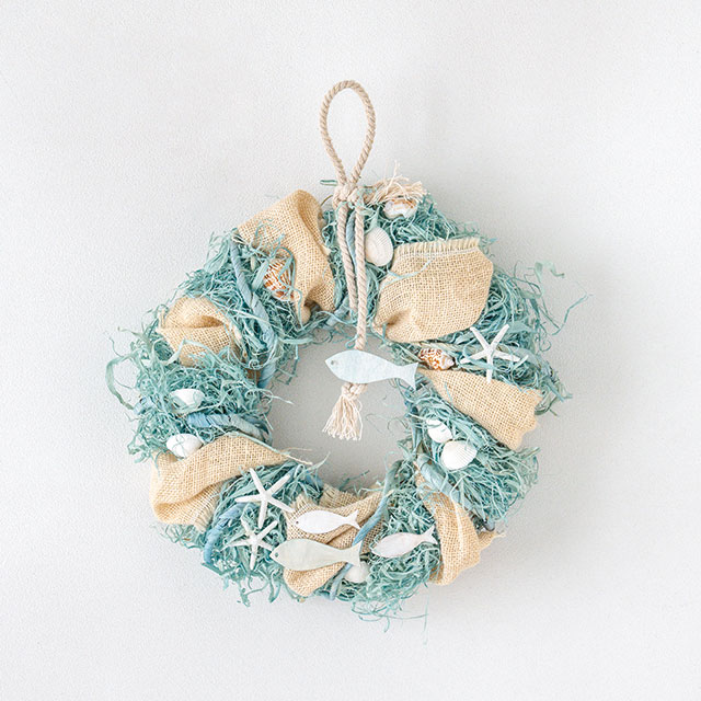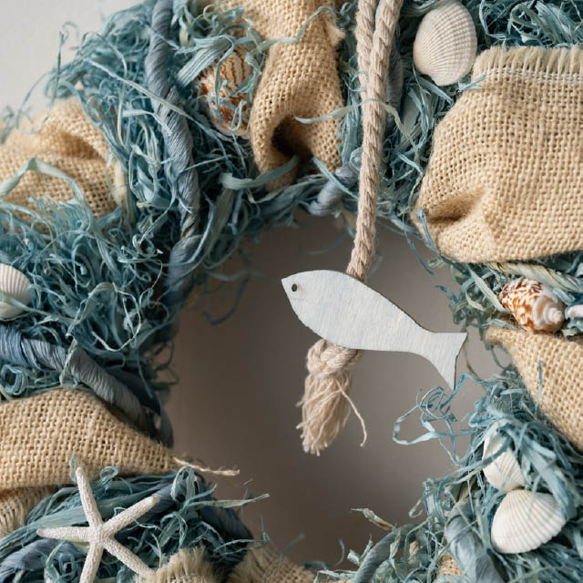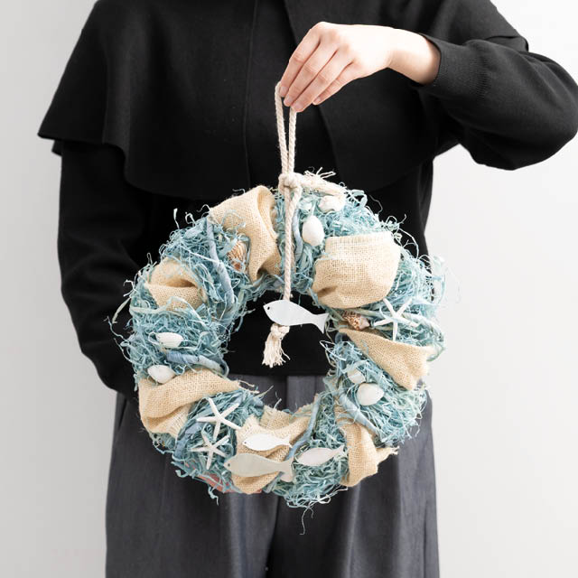 涼しげな夏のリースです。ブルーグリーンとベージュのベースカラーに、貝殻や木製の魚モチーフをあしらっており、サマーテイスト満点。ナチュラルな質感ながら海辺の風景をそのまま切り取ったようなディテールで、店内を一気に夏のムードに演出します。