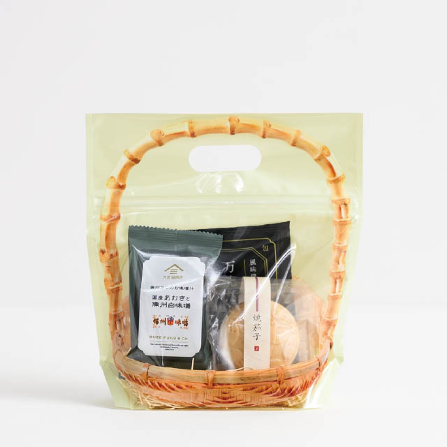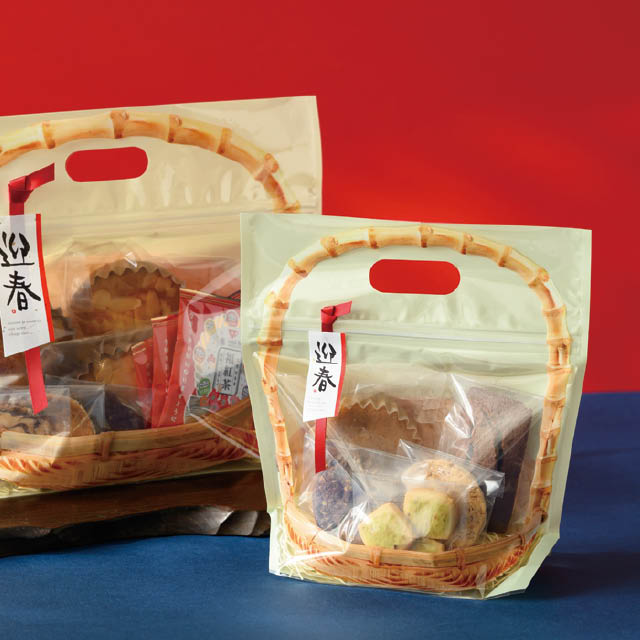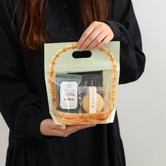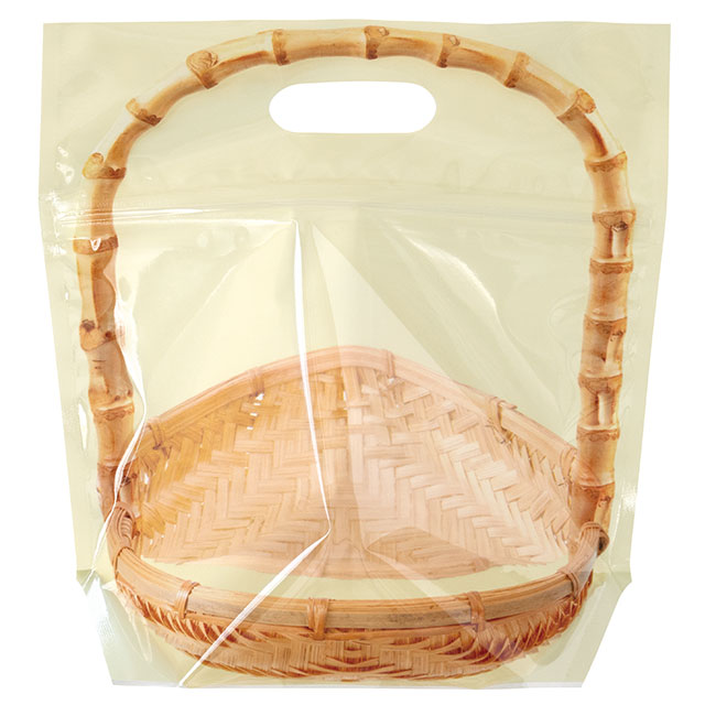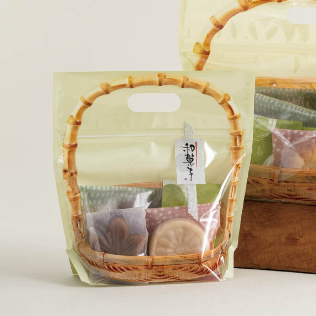 詰め合わせに便利な、竹カゴデザインのジップ付スタンド袋です。ジップ付きなので袋の口を閉じる手間要らずで、カンタンにセットギフトが作れます。ハンドル付きで手に取りやすく、レジまでお客様が持ち運びやすいのもポイント。通年で使えるナチュラルな色合いで、和菓子にも洋菓子にも使えるおしゃれなギフトバッグです。どら焼きが5個程度入るサイズです。