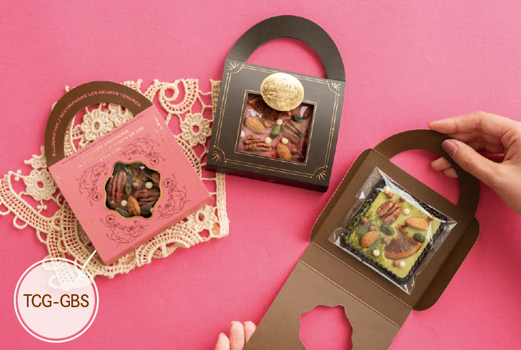 ピンク色のエレガントなデザインのパッケージは、バレンタインデー、ホワイトデーにはもちろん、母の日にもおすすめ。窓から見える色とりどりのタブレットショコラの華やかさが目を引き、思わずハンドルに手を伸ばしてしまう魅力的なギフトを作れます。