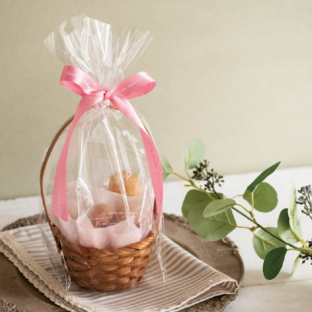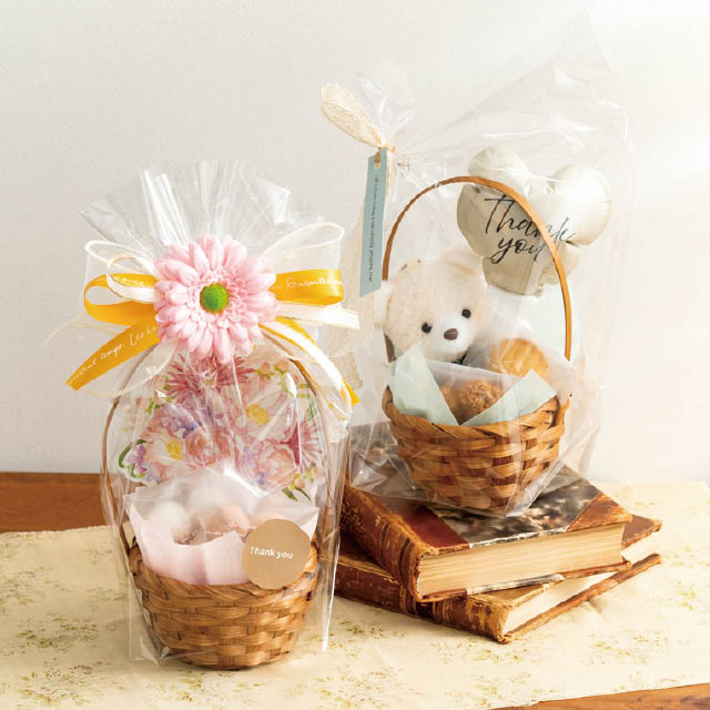 人気のブーケ型スマイリングティーとの相性も抜群で、花かごのような華やかなギフトラッピングに。緩衝材の代わりにマスコットを添えるとギフト単価もアップできておすすめです。