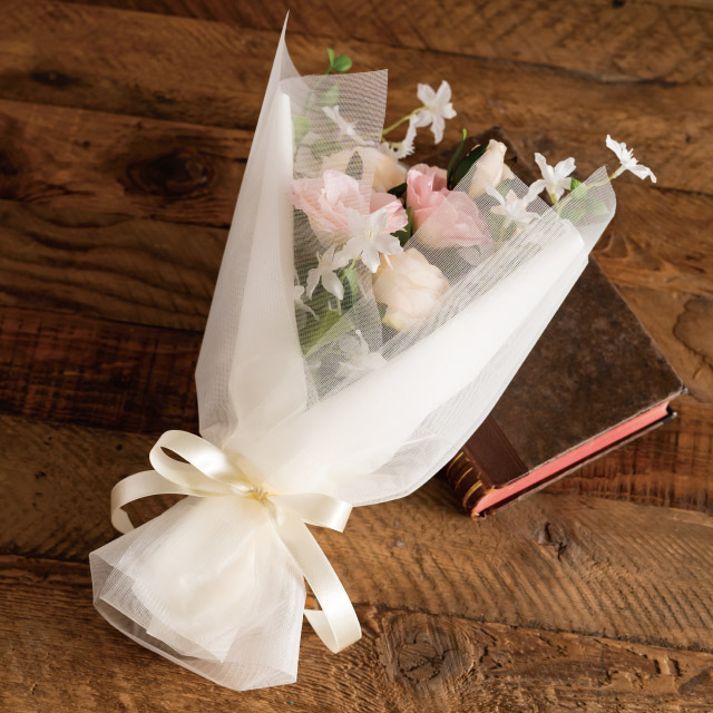 チュールレースのラッピングロールです。アイボリーの落ち着いた色合いのチュール素材がお花を優しく包み込み、おしゃれで可愛らしいブーケができあがり。韓国風ラッピングのドレスブーケにもぴったりのロールです。やわらかい印象ながらハリがある素材で包みやすく、上品なアイボリーカラーがお花の色彩を一層引き立てます。