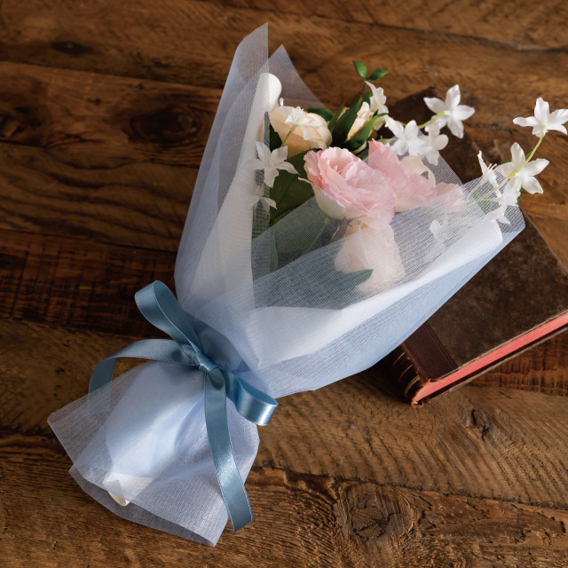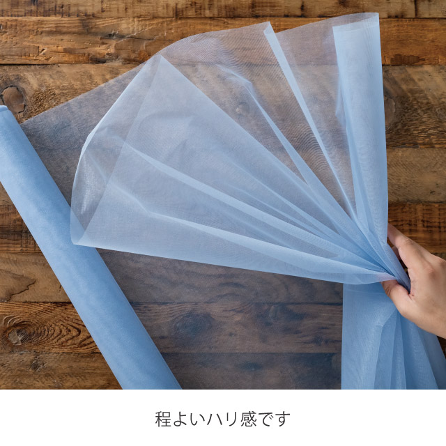 チュールレースのラッピングロールです。スモーキーブルーの落ち着いた色合いのチュール素材がお花を優しく包み込み、おしゃれで可愛らしいブーケができあがり。韓国風ラッピングのドレスブーケにもぴったりのロールです。やわらかい印象ながらハリがある素材で包みやすく、上品なスモーキーカラーがお花の色彩を一層引き立てます。