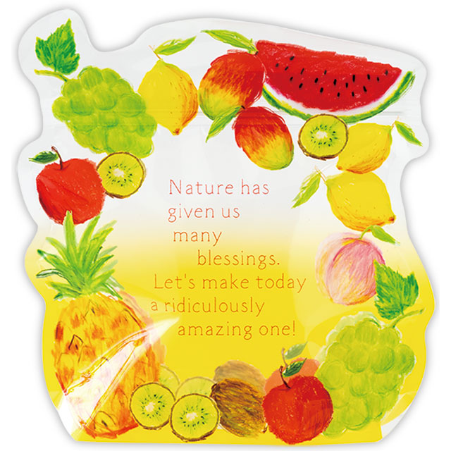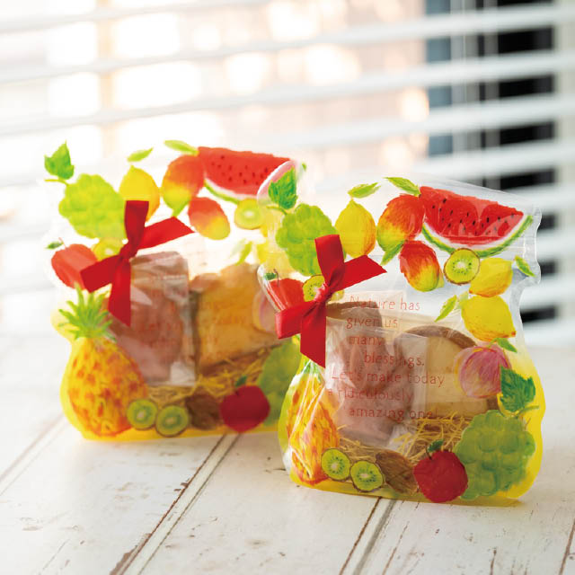 ビタミンカラーとフルーツデザインが可愛いジップ付スタンドバッグです。前面にフルーツをリースのように並べてダイカットで仕上げた動きのあるデザインで、ギフトが賑やかな印象に。リースの窓から中のお菓子が見えるのもポイントです。浅めの底マチがついているので自立します。年中お使いいただけるデザインのギフトバッグですが、元気なビタミンカラーは特に夏のプチギフトにおすすめのギフトバッグです
