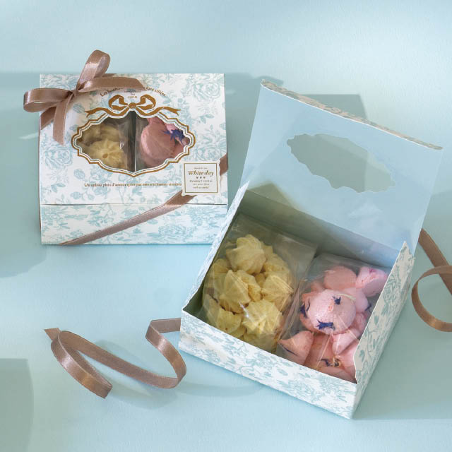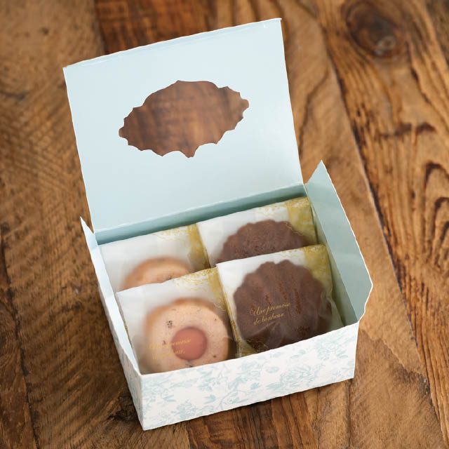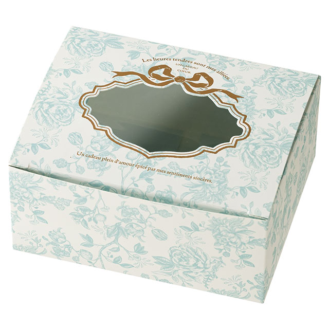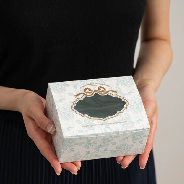 窓付きのギフトボックスです。水色の花柄にゴールドのリボンをあしらった大人なデザインに仕上げました。縁取りのある窓が中の焼き菓子を引き立てます。マドレーヌが4個程度入るサイズ感で、プレゼントにもおすすめです。