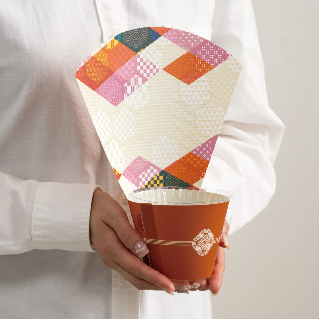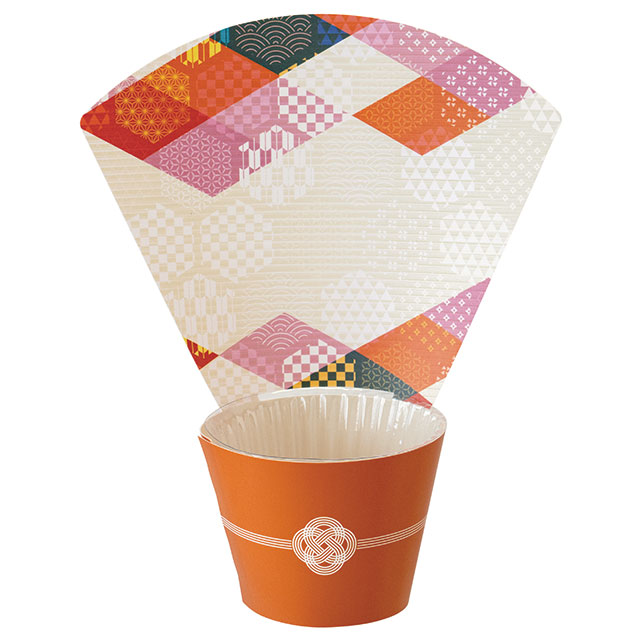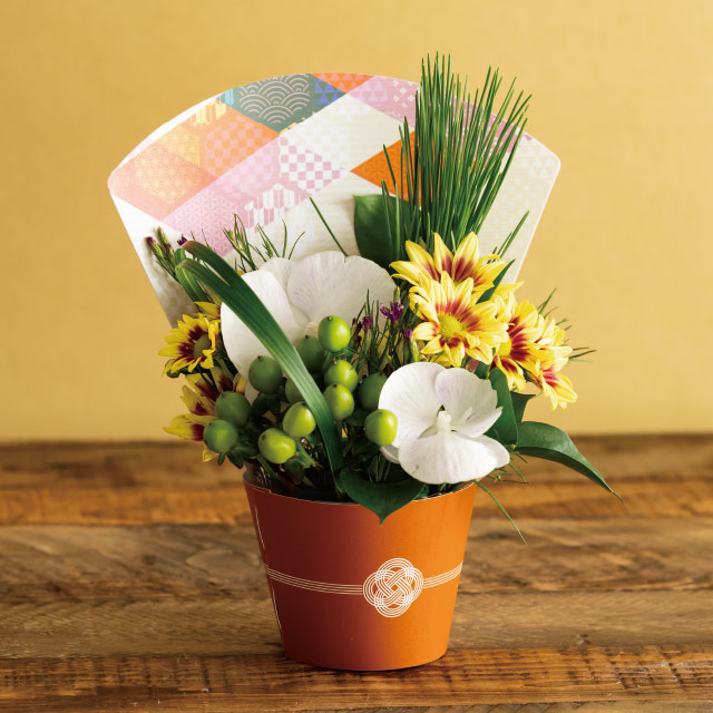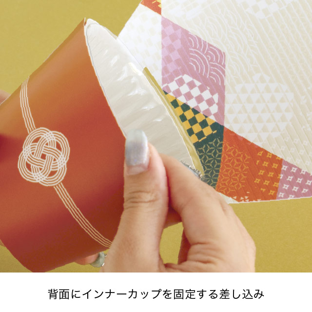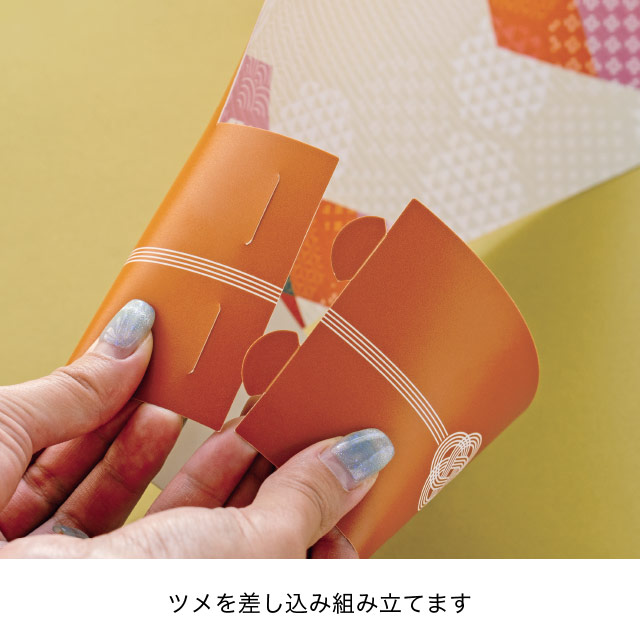 和風のカバーポットです。鮮やかなオレンジが目を引く和風デザインで、お正月のフラワーアレンジメントにおすすめ。つめを差し込むだけで完成の簡単組み立て、インナーカップ付きなのでアレンジメントの作り置きにも最適です。PP製で水濡れにも安心です。