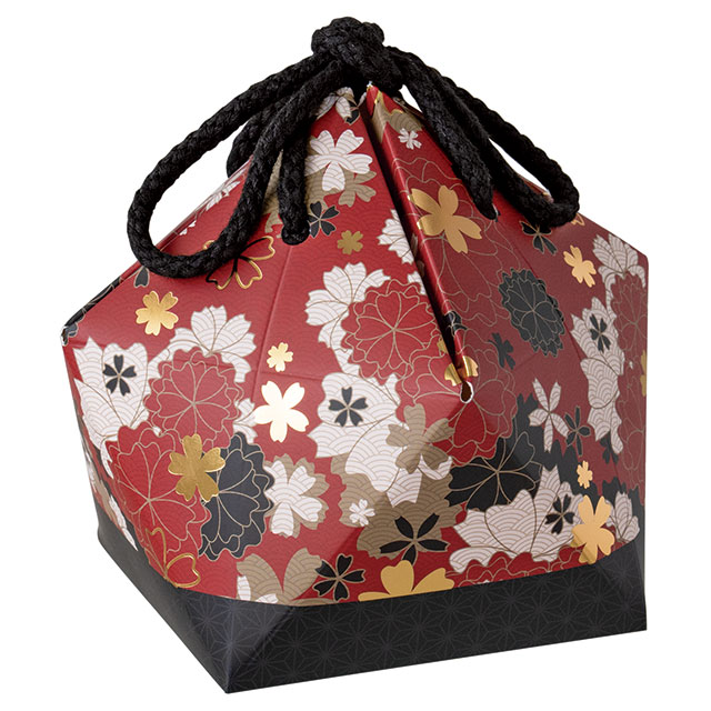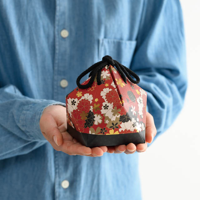 和風の巾着型ギフトボックスです。赤地に色とりどりの花が散りばめられた着物柄に箔押しが入った華やかなデザインで、ギフトに豪華さと特別感を演出してくれます。箱の口を閉じる黒い紐と黒の底面が全体を引き締め、大人可愛い雰囲気に仕上げました。