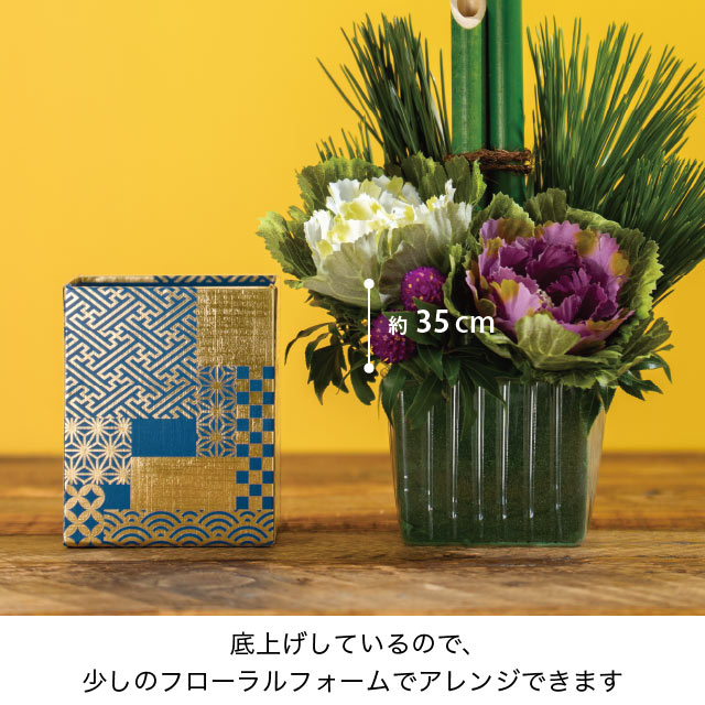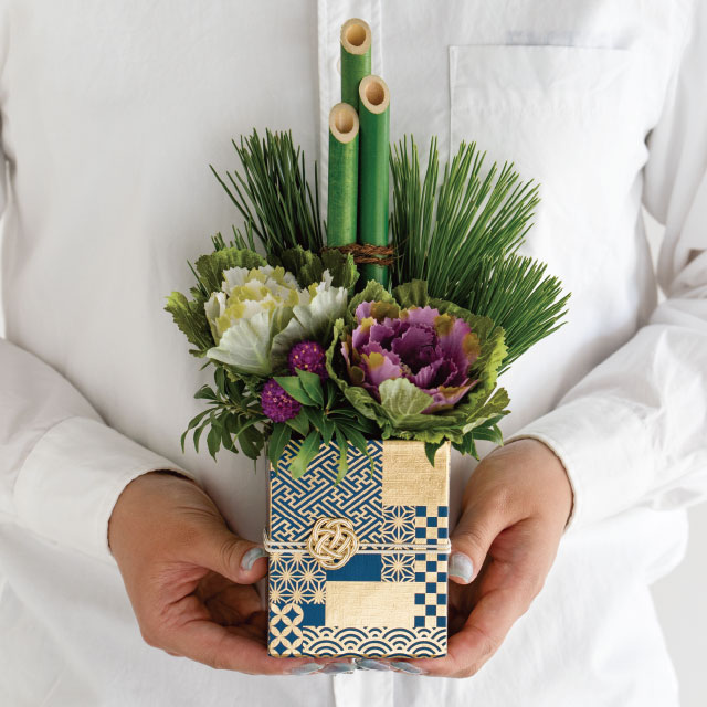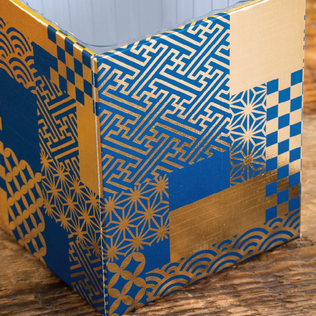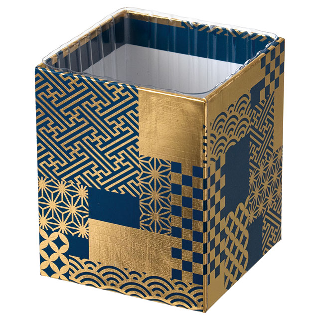 華やかな和柄のフラワーアレンジメント用ギフトトレイです。深い藍色のベースに伝統的な紋様の金箔押しデザインで少ない花材でも豪華な見栄えになり、より高級感のあるフラワーギフトが完成します。