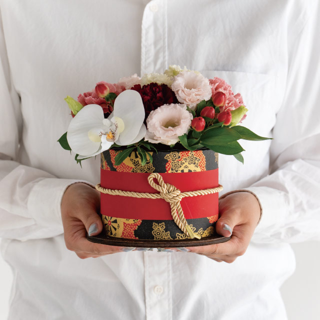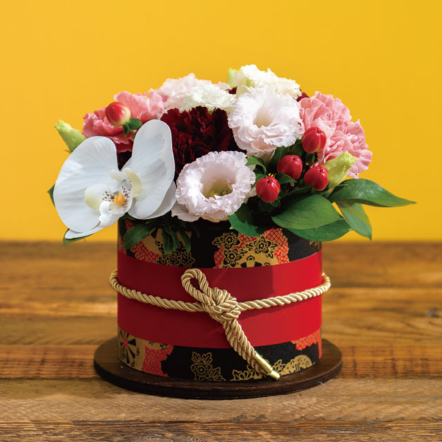 モダンでオシャレな紙管製の和風トレイです。千代紙と組紐が着物のようなイメージに。 底に木の板がついているので安定感もバッチリ!お正月・迎春のフラワーアレンジメントにおすすめの和風トレイです。