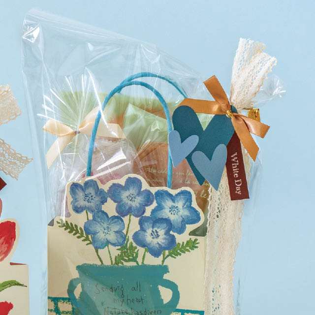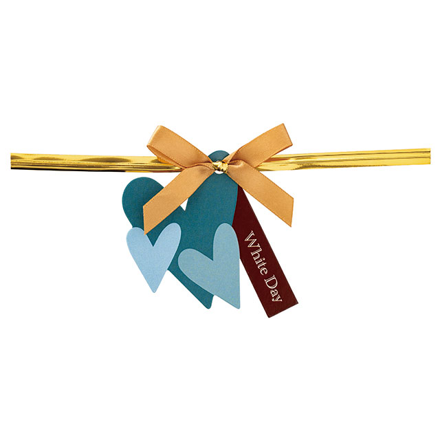 ホワイトデイのギフトタグ付ワイヤータイです。「White Day」のテキストと、ホワイトデイカラーのブルーのハート型ギフトタグに、ゴールドのサテンリボンをあしらったデザインで、このワイヤータイだけで簡単にホワイトデイギフトを作っていただけます。