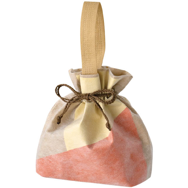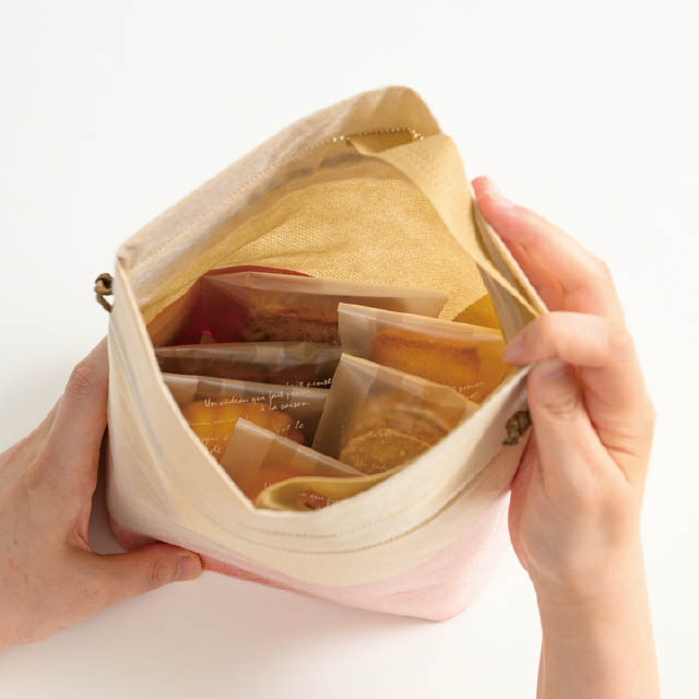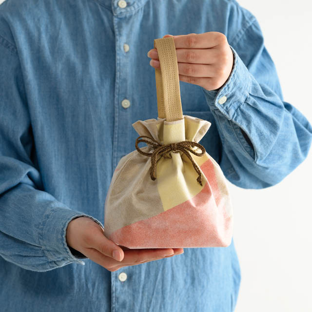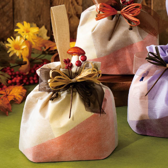 落ち着いた和風カラーと、重ねた不織布の透け感が上品な巾着バッグです。ワンハンドル仕様で持ちやすく、手土産やお持たせにもぴったり。どら焼きやブッセ、芋・栗・南瓜を使った和スイーツはもちろん、和洋問わず様々なお菓子のラッピングにお使いいただける巾着バッグです。