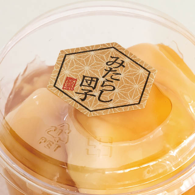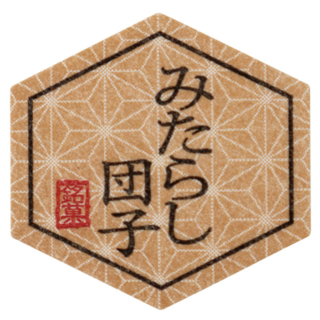 みたらし団子用の銘菓シールです。薄い黄土色に麻の葉模様と「みたらし団子」の筆文字をあしらった六角形のシールで、赤い落款風の「銘菓」の印がアクセントになって高級感を演出。ナチュラルな和紙の風合いもよく、個包装やギフトパッケージに貼るだけで、和菓子のおいしさと品格をより一層引き立ててくれます。贈答用ギフトラッピングにもおすすめのシールです。