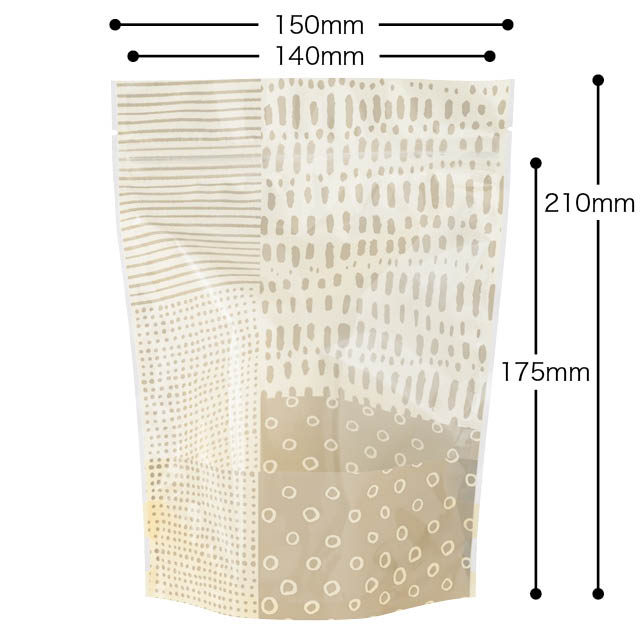 開閉に便利なジップ付きの乾燥剤対応スタンドバッグに、ベージュの和モダン柄が登場。おかきやあられなどを入れてお使いいただくのにぴったりな商品です。