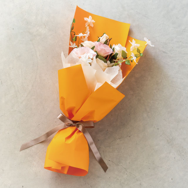 マリーゴールドのOPPラッピングロールです。パステルからスモーキーまで揃う豊富なカラー展開。使いやすい柔らかさと手触りが特徴で、ブーケを包みやすくロスも少ない50cm幅のラッピングロールです。