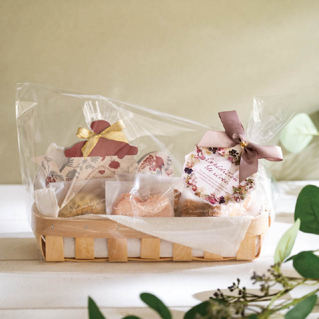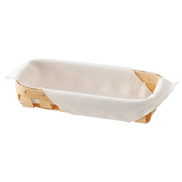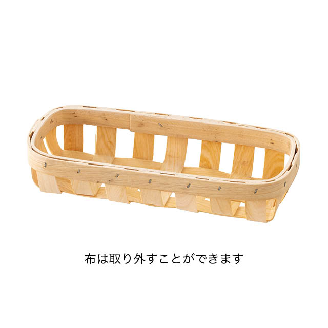 横長タイプの木製バスケット(クロス付き)です。シンプルなデザインながらも、自然素材を使った手作りの風合いとやさしいナチュラルカラーで、幅広いお店の雰囲気に馴染むバスケットです。付属のクロスが中身を優しく包み込むため緩衝材も少なくて済み、手間と資材を削減可能。横長サイズなので手提げ袋にも入れやすく、持ち帰りやすいのもメリットです。ギフトとしてもらった後もリユースできるエコロジーなラッピング資材です。