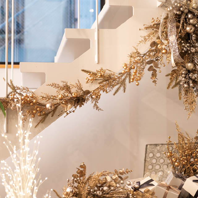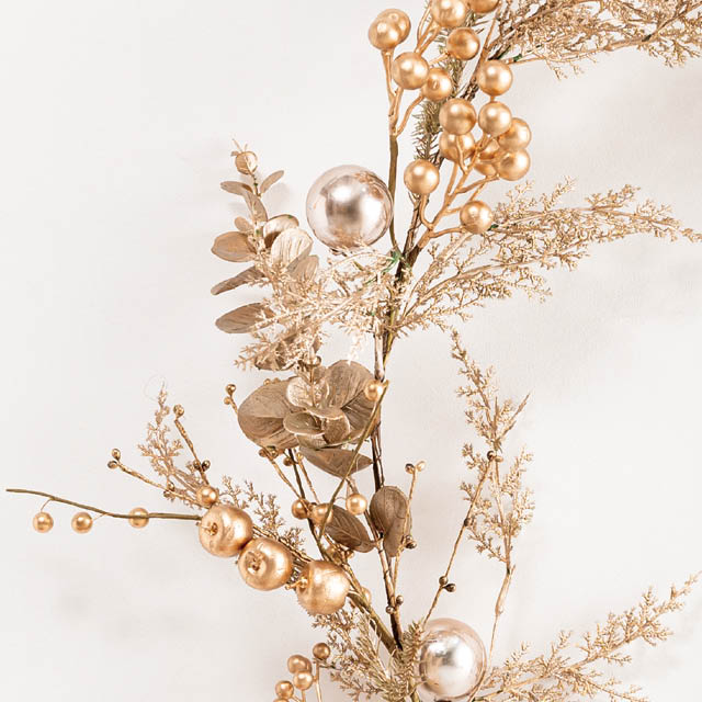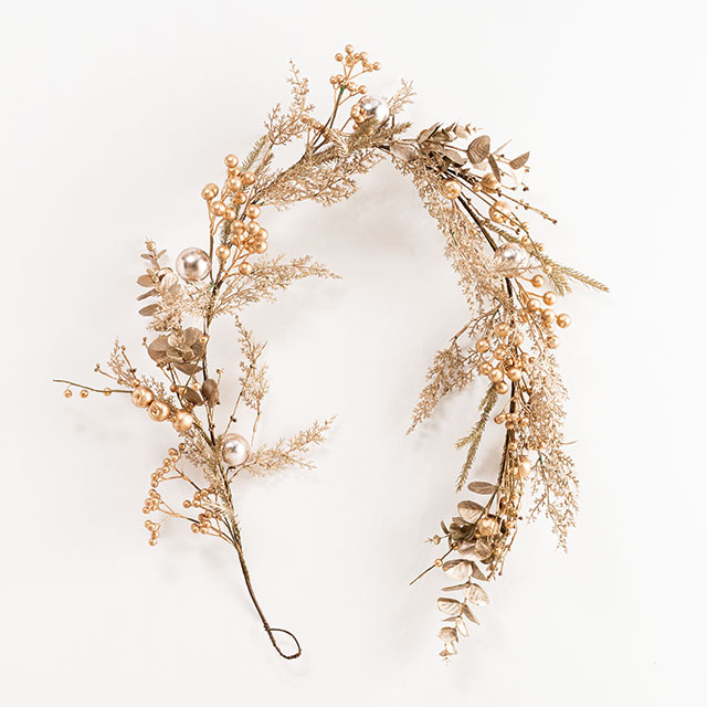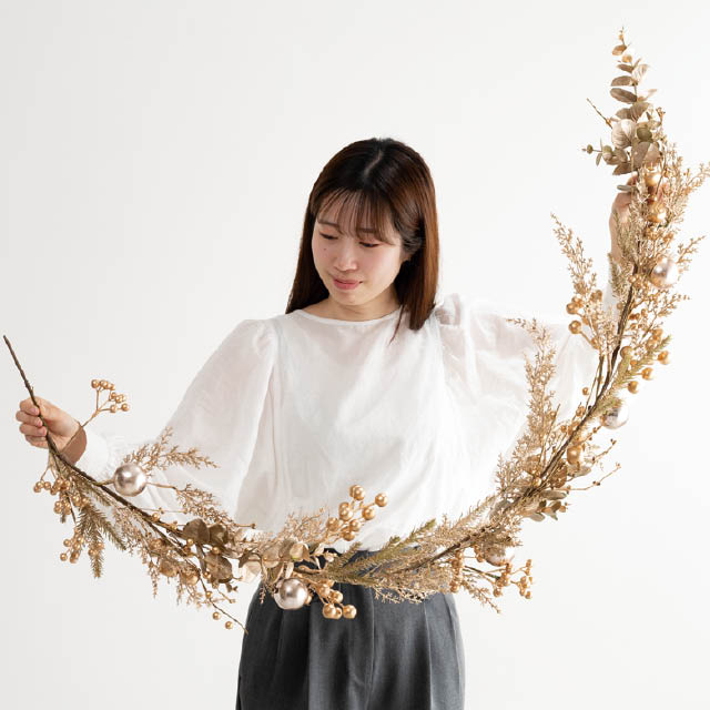 ゴールドの造花ガーランドです。華やかで上品なゴールドが目を惹き、本格的なクリスマスの雰囲気を簡単に演出できます。両端には取り付け用のリングが付いているので、飾り付けも簡単。ガーランドとして天井飾りに使うのはもちろん、棚やカウンター周りや、クリスマスリースと一緒にコーディネートするのもおすすめです。特別感のあるクリスマスデコレーションをお求めの方におすすめのガーランドです。
