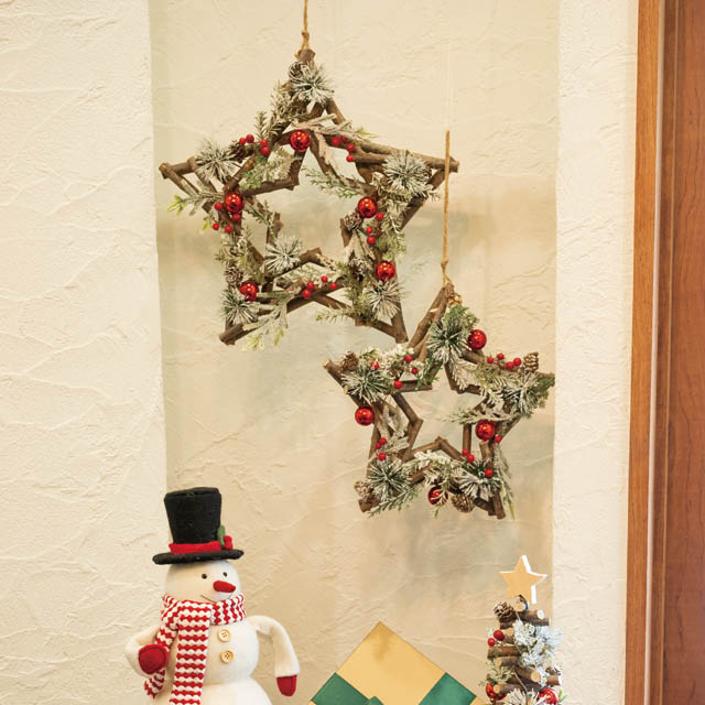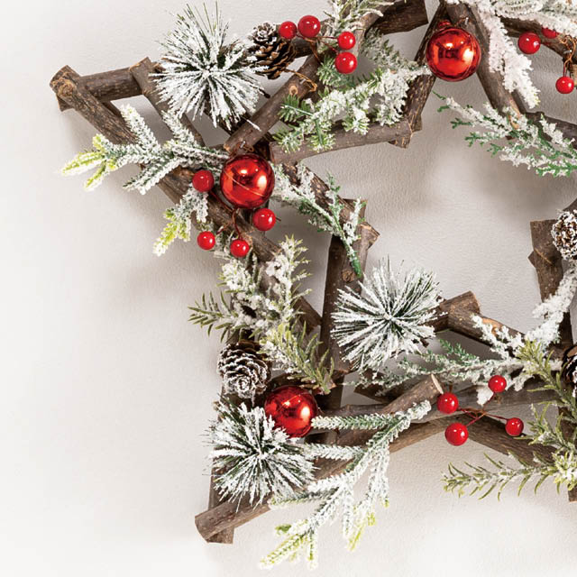 星形のクリスマスリースです。星形に組んだ木の土台に赤い実や雪化粧の葉がバランスよく散りばめ、北欧風の優しい雰囲気に仕上げました。W430×D40×H430mmの存在感のあるサイズで、店内の壁や入口に飾ればクリスマスらしい華やぎを演出。シンプルなデザインでどんなお店のインテリアにも自然と馴染みます。店舗のクリスマス装飾や季節感アップにおすすめのリースです。