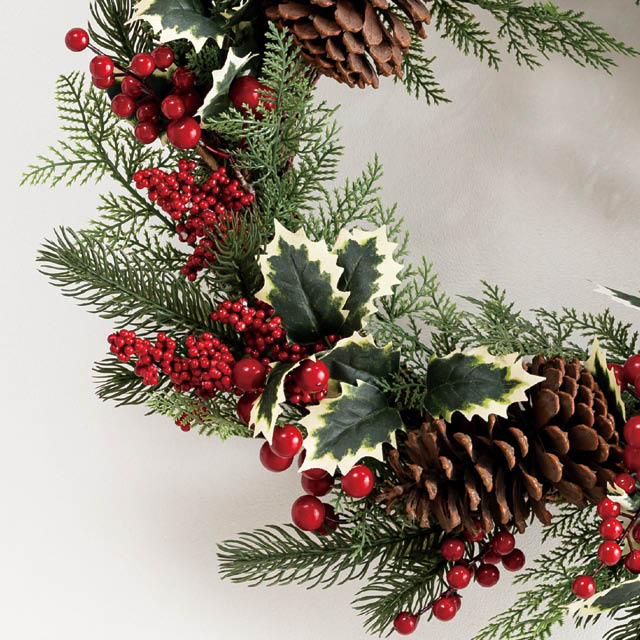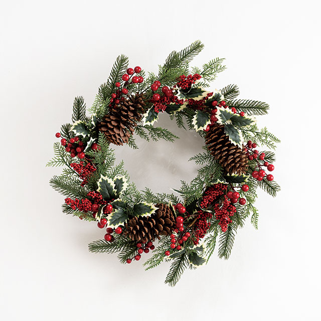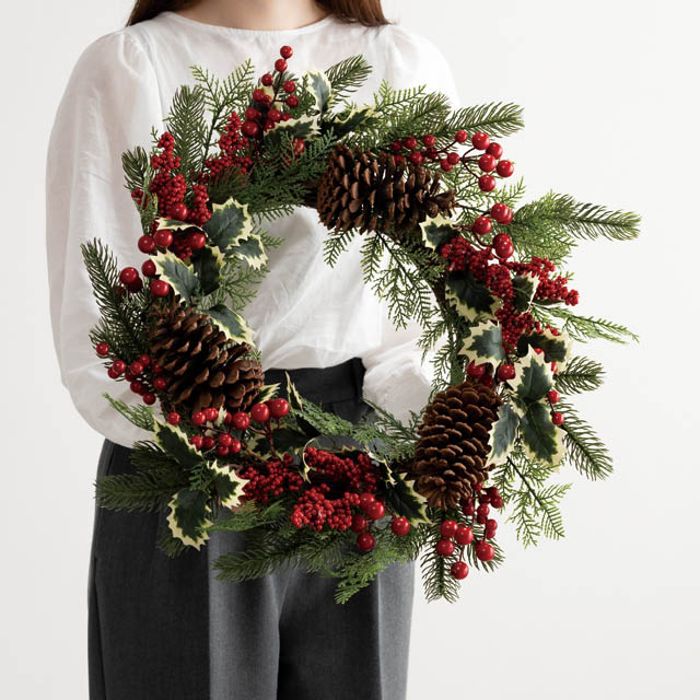 華やかなクリスマスリースです。グリーンの葉と赤い実のコントラストが美しく、大きな松ぼっくりがアクセントに。直径約580×D160mmサイズで存在感もたっぷり、壁面や入口に飾るだけでお店のクリスマスムードを高めてくれます。温かみのあるデザインは、様々なテイストのお店にぴったり馴染みます。