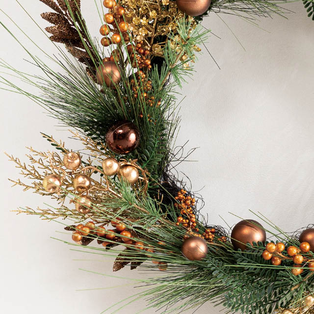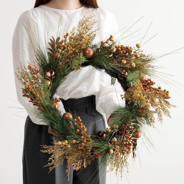 上品なクリスマスリースです。キラッと輝くブラウンとゴールドのオーナメントが目を惹き、直径約560×D160mmの存在感のあるサイズで店内の壁や入口を華やかに彩ります。統一感のある落ち着いた色味が高級感を演出し、他とはひと味違う洗練されたクリスマスムードに。シックな雰囲気を求めるお店のクリスマス装飾におすすめのクリスマスリースです。
