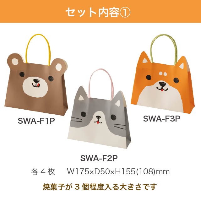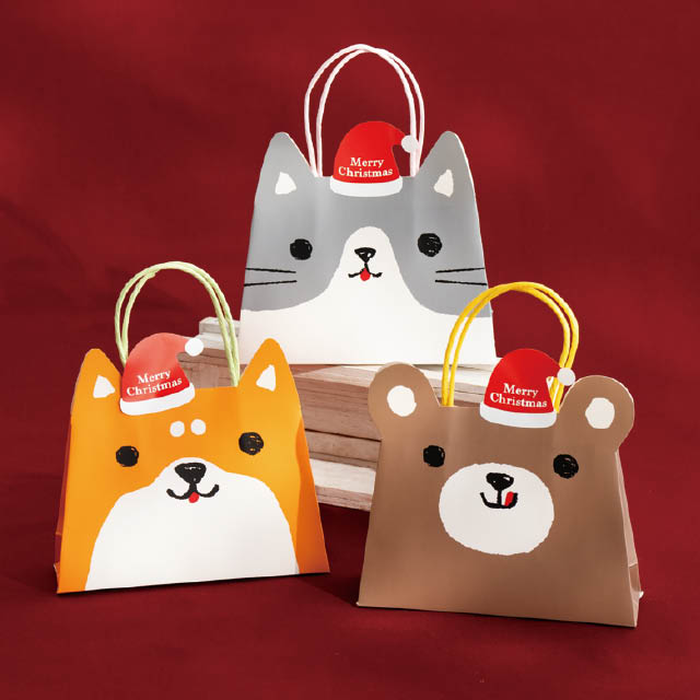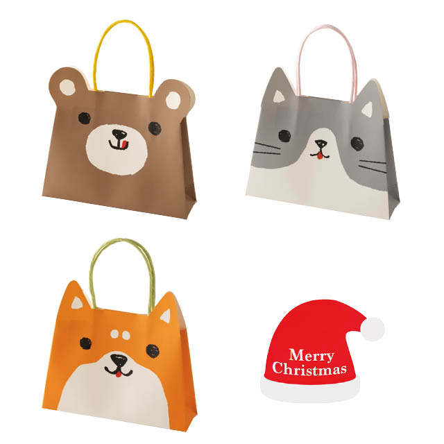 イベント資材は余ると困る!そんなお客様のお声から生まれた、クリスマスギフトにおすすめのラッピング資材セットです。犬、ネコ、クマの3種類のアニマルハンドルバッグと、サンタ帽シールがセットになったお得なギフトラッピングです。1回の購入で資材が揃う、便利なラッピングセットをぜひお試しください。