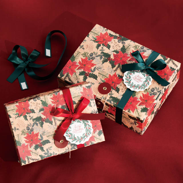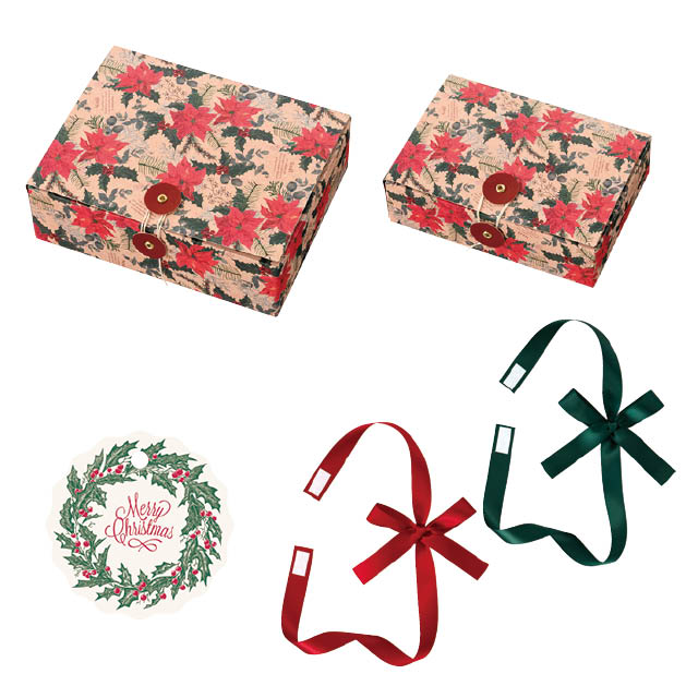 イベント資材は余ると困る!そんなお客様のお声から生まれた、クリスマスギフトにおすすめのラッピング資材セットです。ポインセチア柄のボックス2サイズに、リボンが2色、クリスマスギフトタグがセットになったお得なギフトラッピングです。両面テープ付きの完成形リボンはこのセットだけの限定品!1回の購入で資材が揃う、便利なラッピングセットをぜひお試しください。