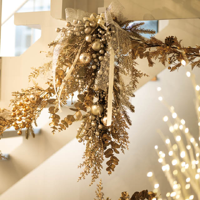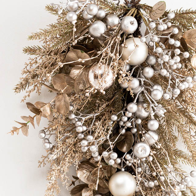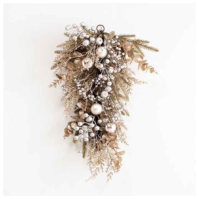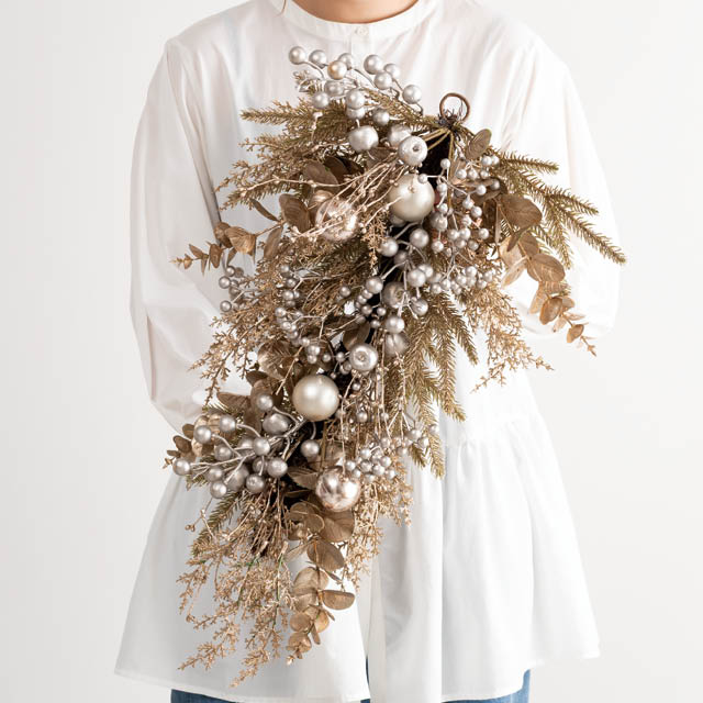 ゴールドの造花スワッグです。洗練されたシャンパンゴールドを基調に、艶やかに輝くオーナメントやパール調のデコレーションが高級感を引き立てます。W470×H630mmのしっかりしたボリューム感で店舗のエントランスや壁面を彩り、特別なクリスマスを演出。他とはひと味違ったクリスマス空間を手軽に実現したい方におすすめのリースです。取付用の輪っかが付いているので、飾りつけも簡単です。
